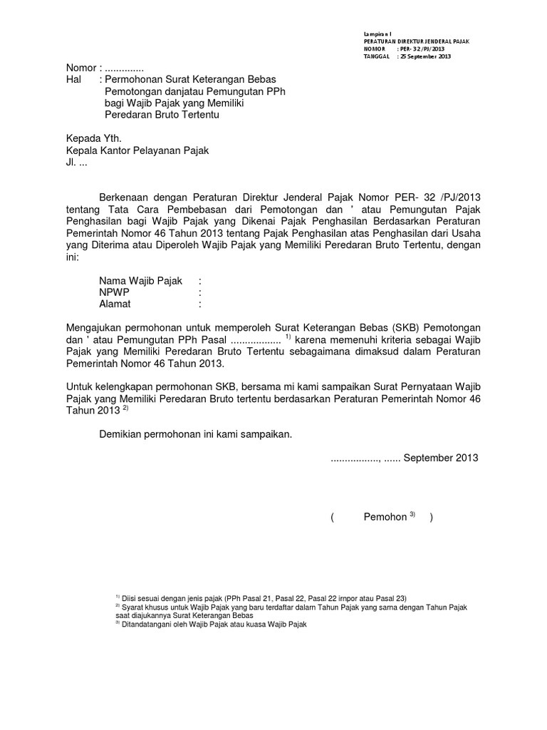 Contoh surat keterangan bebas pajak. Keterangan adanya manfaat surat keterangan ini dapat kita baca pada peraturan menteri keuangan nomor 99pmk032018 tentang pelaksanaan peraturan pemerintah nomor 23 tahun 2018 tentang pajak penghasilan atas penghasilan dari usaha yang diterima atau diperoleh wajib pajak yang memiliki peredaran bruto tertentu. Pernyataan yang bertandatangan di bawah ini diikuti beberapa keterangan. Surat keterangan bebas pph pasal 21pasal 22 selain impor pph pasal 22 imporpph pasal 23. Kop surat berisi keterangan dokumen syarat keterangan non pkp. Sesuai dengan lampiran peraturan direktur jenderal pajak nomor per 32pj2013 tentang tata cara pembebasan dari pemotongan danatau pemungutan pajak penghasilan bagi. Skb ppn bisa dikatakan surat sakti dimana yang memegang skb ppn ini mendapatkan fasilitas untuk tidak dikenakan ppn atas kegiatan impor atau kegiatan penyerahan barangjasa kena pajak bkpjkp tertentu.
