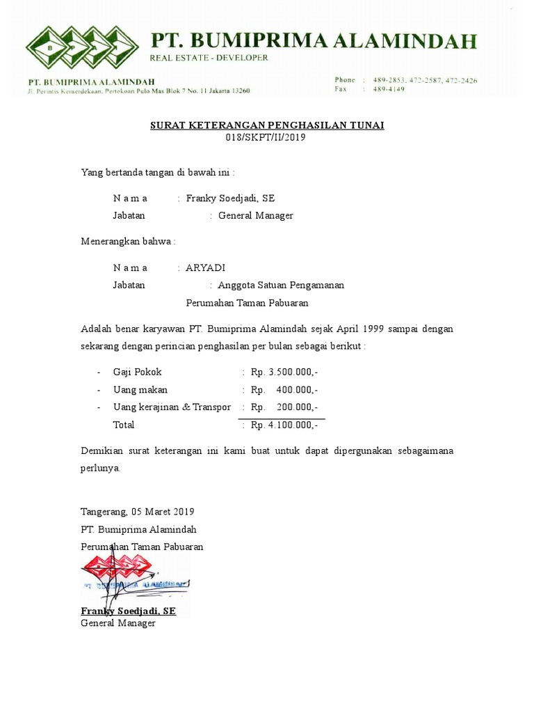 Contoh surat ini merupakan salah satu syarat yang harus dilengkapi oleh karyawan tersebut dalam mengajukan permohonan pinjaman atau kredit. Sekarang dalam keuangan memang bisa dibantu dengan kpr atau kartu kredit sehingga jika ingin membeli barang tidak bingung lagi. Word file doc file ini merupakan folder zip yang berisi 57 draf dokumentasi legal ketenagakerjaan karyawan perusahaan yang masing masing dalam bentuk format ms word doc. Contoh surat keterangan penghasilan gaji masalah penghasilan atau gaji seseorang biasanya amat tertutup tetapi ada kalanya harus dibuka secara publik dikarenakan diperlukan sebagai salah satu syarat misalnya proses pinjaman kredit proses kpr atau sebagai keterangan gaji orang tua untuk dilampirkan pada saat permintaan dari sekolah untuk mengurus beasiswa dan lain lain. Fungsi utama dari penerbitan surat ini adalah untuk menjelaskan dan membenarkan sebuah fakta yang dibutuhkan sebagai data administrasi. Apalagi ketika karyawan tersebut akan mengajukan pinjaman atau kredit ke perusahaan leasing.