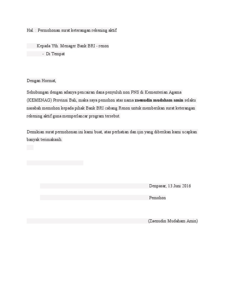 Maka kali ini saya akan mencoba berbagi contoh surat permohonan keterangan bank. Nah ada persyaratan dokumen yang ditetapkan pihak bank baik bank negeri maupun swasta untuk membuka rekening baru dan untuk pastinya dapat anda tanyakan sendiri pada bank yang bersangkutan namun yang dapat dipastikan adalah kartu tanda penduduk ktp dan surat keterangan domisili atau surat keterangan kerja jika anda bukan berasal dari daerah tempat pembukaan rekening. 3 contoh surat referensi bank untuk keperluan bisnis surat referensi bank surat yang dibuat dimana isi dari surat tersebut dibuat oleh sebuah bank untuk diberikan kepada nasabahnya dimana isi yang ada di dalam surat tersebut bersifat tidak mengikat tidak menjanjikan serta tidak memberikan jaminan dalam bentuk apapun. Sehubungan dengan pencairan dana guru sekolah minggu buddhis oleh kementrian agama kemenag provensi nusa tenggara barat maka saya pemohon atas nama denawanto mengajukan permohonan surat keterangan rekening aktif kepada bank bri kcp cakera negara guna memperlancar proses pencairan dana tersebut. Surat keterangan aktif kerja biasanya dibuat oleh pihak hrd ataupun bagian administrasi dan kesekretariatan perusahaan. Demikian surat pernyataan ini dibuat untuk dapat dipergunakan sebagaimana mestinya.