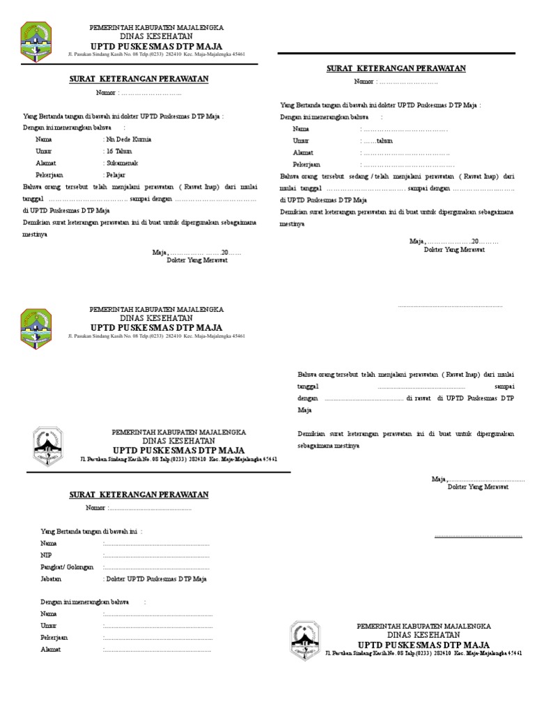 Contoh surat keterangan sakit dari puskesmas merupakan hastag atau topik khusus untuk mengelompokkan gambar contoh surat keterangan sakit dari puskesmas terbaru dari situs kumpulan contoh surat dengan tujuan untuk memudahkan navigasi anda dalam mencari kategori sesuai keinginan. Atau jika membuatnya bukan di puskesmas misalnya di rumah sakit berarti harus ada cap basah dari rumah sakit tersebut karena untuk menunjukkan keaslian dari surat keterangan sehat ini. Contoh surat keterangan kematian 1 adalah surat keterangan kematian yang diterbitkan oleh pihak rumah sakit untuk keluarga yang ditinggalkan. Contoh surat keterangan kematian 2 adalah surat keterangan kematian yang diterbitkan oleh dinas kependudukan dan catatas sipil disdukcapil yang biasa digunakan untuk mengajukan pencairan dana asuransi jiwa pembagian hak waris dl. Jika anda sedang dalam kondisi sakit maka tentu anda akan berusaha pergi ke dokter ataupun berobat ke klinik dan puskesmas. Kendati demikian tetap terdapat poin poin penting sebagaimana yang telah disebutkan di atas tadi.