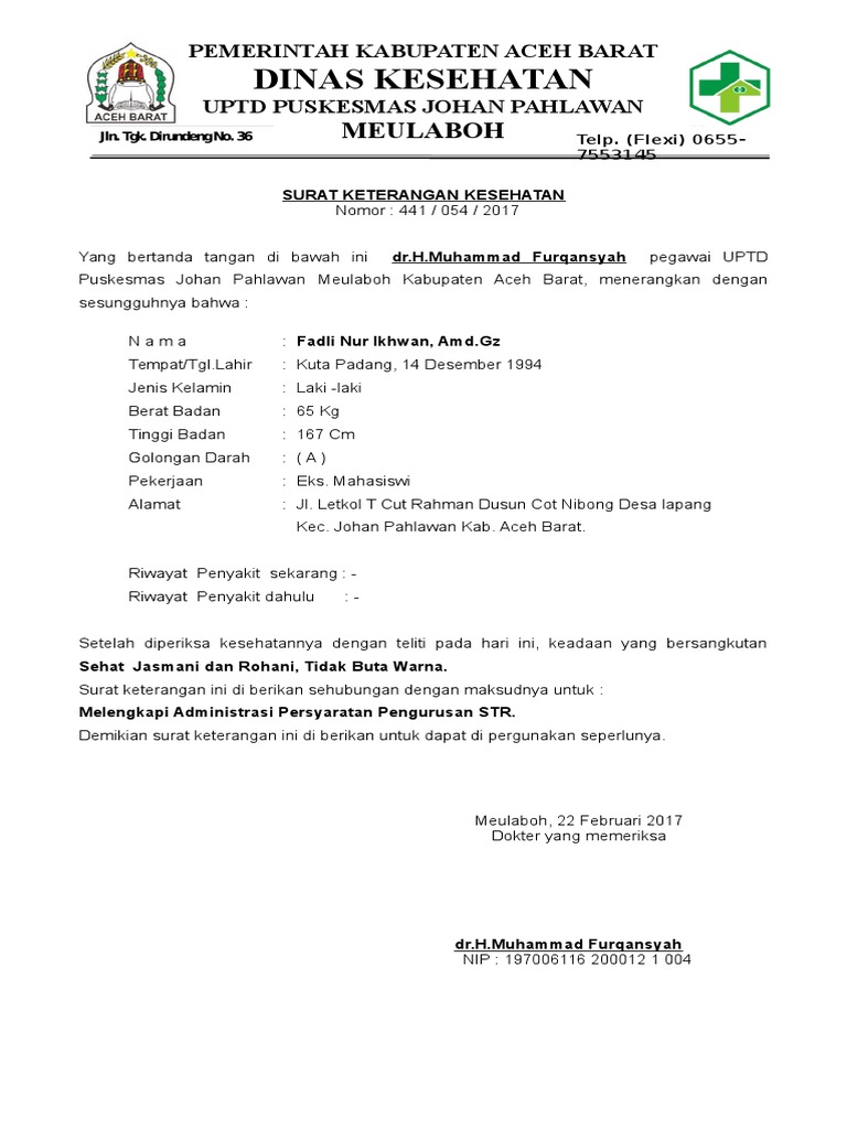 Contoh surat keterangan sehat jasmani dan rohani. Surat keterangan jiwa dan hasil dari pemeriksaan masing masing poli akan ditelaah oleh dokter interna untuk dibikinkan kesimpulan untuk sehat jasmani dan rohani hasilnya akan diserahkan ke yang bersangkutan. Silahkan cek kembali data kalian dalam surat keterangan tersebut. Sampai sini proses selesai. Surat keterangan sehat jasmani dari rsud dr. Indra jaya rajagukguk sh 2. Surat ini menjadi salah satu dokumen pelengkap yang harus dimiliki jika mendaftar pada instansi atau perusahaan tertentu.