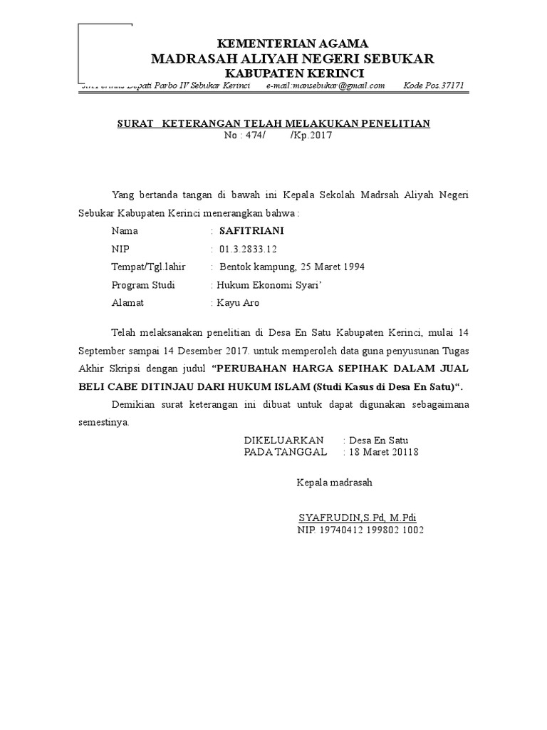 Contoh surat keterangan selesai penelitian. Telah selesai melakukan penelitian di madrasah tsanawiyah mts muhammadiyah 2 kedungkandang malang jawa timur pada tanggal 10 april 2012 sampai tanggal 01 juni 2012 dengan baik. Kemudian setelah melakukan penelitian tersebut maka diperlukanlah surat keterangan penelitian yang nantinya akan di cantumkan di dalam skripsi kita. Contoh surat pernyataan telah melakukan penelitian. Dibawah ini ada beberapa contoh surat keterangan telah melakukan penelitian skripsi tinggal di kondisikan dan di ganti sesuai dengan pemakainnya. Adalah benar benar telah melaksanakan penelitian di yayasan taufiqurrahman tahun pelajaran 20122013 terhitung sejak 02 januari sd 10 april dalam rangka penyusunan. Bagi kawan kawan yang belum tahu membuat atau masih memerlukan contoh surat keterangan penelitian maka saya akan membagikan kepada kawan kawan beberapa contoh suratnya.