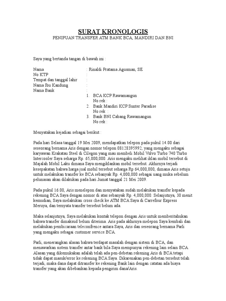 Contoh surat kronologis penipuan. Membuat surat kronologis kejadian pelaporan rekening penipu ke bank penipu online penipuan online kasus melaporkan ke bank membuat permohonan pemblokiran surat keterangan kepolisian. Surat kronologis kejadian penipuan the instructional design of teaching writing based on 2013. Bukti percakapan bukti transaksi. Contoh surat berita acara contoh surat contoh berita acara kronologis kecelakaan untuk klaim bpjs 7 contoh surat pernyataan dalam berbagai kasus gratis doc file. Download contoh surat kronologis kejadian disini 3. Contoh surat kronologis penipuan.