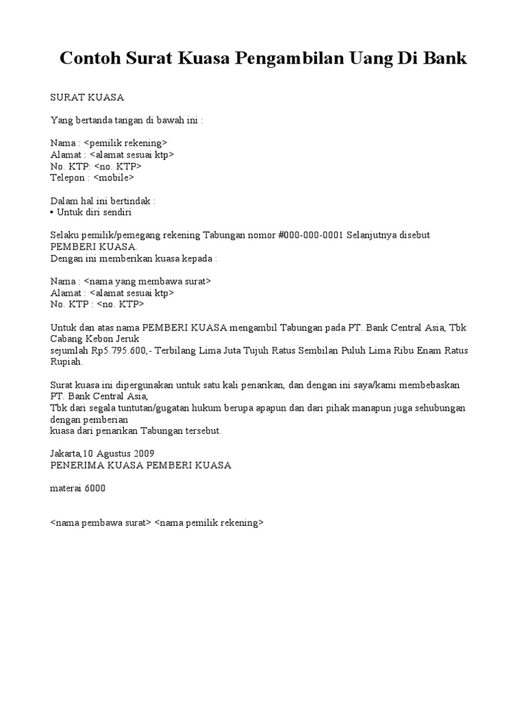 Contoh surat kuasa pengambilan uang di bank mari kita lanjutkan pembahasan kita seputar dunia surat menyurat. Jangan lupa tambahkan materai 6000 satu buah saja di tengah tengah tanda tangan kedua belah pihak dan ditandatangani oleh kedua belah pihak tersebut. Bisa saja terjadi beberapa hal yang membutuhkan jenis surat ini misalnya mengurus kartu atm. Pengambilan uang pensiun melalui surat kuasa tersebut harus di bank tempat membuka rekening tabungan pensiun. Yang akan kita bahas pada kesempatan kali ini adalah mengenai contoh surat kuasa pengambilan uang di banksekadar mengingatkan para pembaca sekalian bahwa surat kuasa adalah surat yang dibuat dengan tujuan untuk memberikan suatu kuasa atau wewenang kepada pihak tertentu guna. Selain itu masih banyak lagi hal hal di bank yang perlu diurus dengan surat kuasa.