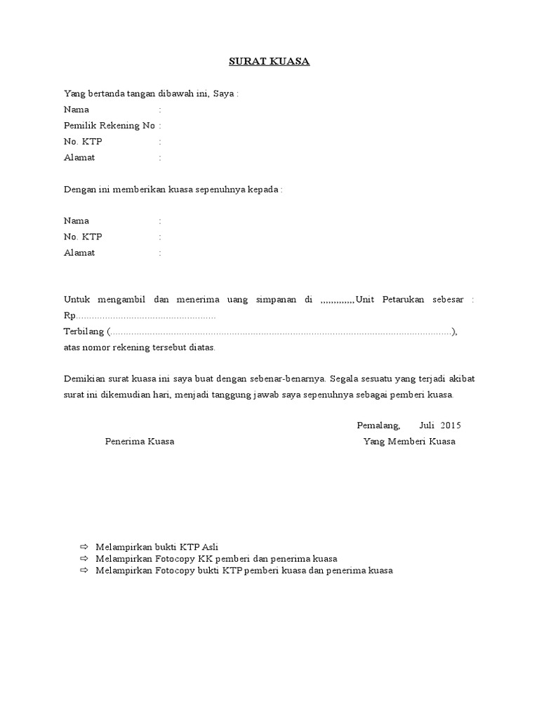 Contoh surat kuasa pengambilan uang doc. Yang akan kita bahas pada kesempatan kali ini adalah mengenai contoh surat kuasa pengambilan uang di banksekadar mengingatkan para pembaca sekalian bahwa surat kuasa adalah surat yang dibuat dengan tujuan untuk memberikan suatu kuasa atau wewenang kepada pihak tertentu guna. Sehingga setiap instansi yang mengeluarkan surat resmi baik itu untuk kedinasan kuasa mauapun surat lainnya yang memiliki kop surat yang berlabelkan dari instansi. Surat kuasa ini dibuat karena seseorang yang berkepentingan sedang berhalangan sehingga tidak dapat melakukannya sendiri maka menyuruh orang lain dengan memberikan surat kuasa ini. Dengan membaca artikel ini kamu akan bisa membuat surat kuasamu sendiri untuk berbagai keperluan. Seperti saat seseorang ingin mengambil uang di bank karena pengambilan uang di bank harus orang yang mempunyai rekening maka orang lain tidak bisa mengambilnya. Misalnya surat kuasa untuk perwakilan pengambilan ijazah pengambilan uang gaji pengambilan paspor pengambilan dokumen dokumen penting dan lain lain.