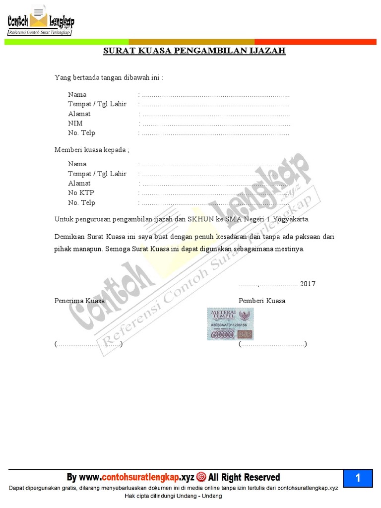 Bandung 17 agustus 1963 alamat. Surat kuasa harus ditempel materai 6000 sebagai simbol resmi pemberian kuasa pada pihak kedua. Karena pihak imigrasi tidak akan menyerahkan paspor kita orang lain maka hal ini yang melatar belakangi pembuatan surat kuasa pengambilan paspor ini. Nama lengkap perwakilan anda seperti tertera pada id yang dikeluarkan pemerintah. Begini secara umum surat kuasa adalah sebuah surat yang berisi pernyataan bahwa kita memberikan kuasa atau wewenang kepada seseorang secara resmi untuk menggantikan posisi kita saat itu. Surat kuasa pengambilan bpkb motor yamaha.