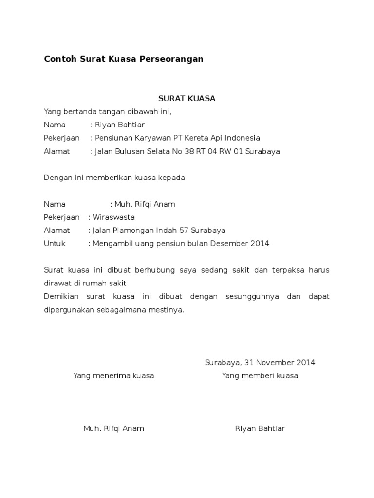 Contoh surat kuasa surat kuasa merupakan surat yang memiliki informasi berupa pemberian kuasa ataupun kewenangan kepada seseorang yang sudah dipercaya dan dipilih sehingga orang tersebut bisa bertindak dengan nama pemberi kuasa. Contoh surat kuasa istimewa peseorangan dan kedinasan surat kuasa adalah surat untuk memberikan kuasa terhadap orang yang dipercaya untuk dapat mewakilkan dirinya dalam melakukan tugasbanyak alasan kenapa seseorang harus membuat surat kuasa bisa jadi karena terlalu padatnya tugas dan kegiatan sehingga tidak dapat melakukan salah satu tugas penting lainnya bisa jadi juga karena sakit atau. Demikianlah mengenai contoh surat kuasa perseorangan dengan format profesional sebagai referensi dalam membuat surat kuasa perseorangan yang baik. Fb twitter wa line pinterest g linkedin. Contoh surat kuasa merupakan sajian kami dalam membantu anda yang kesulitan cara membuatnya. Contoh surat kuasa perseorangan.