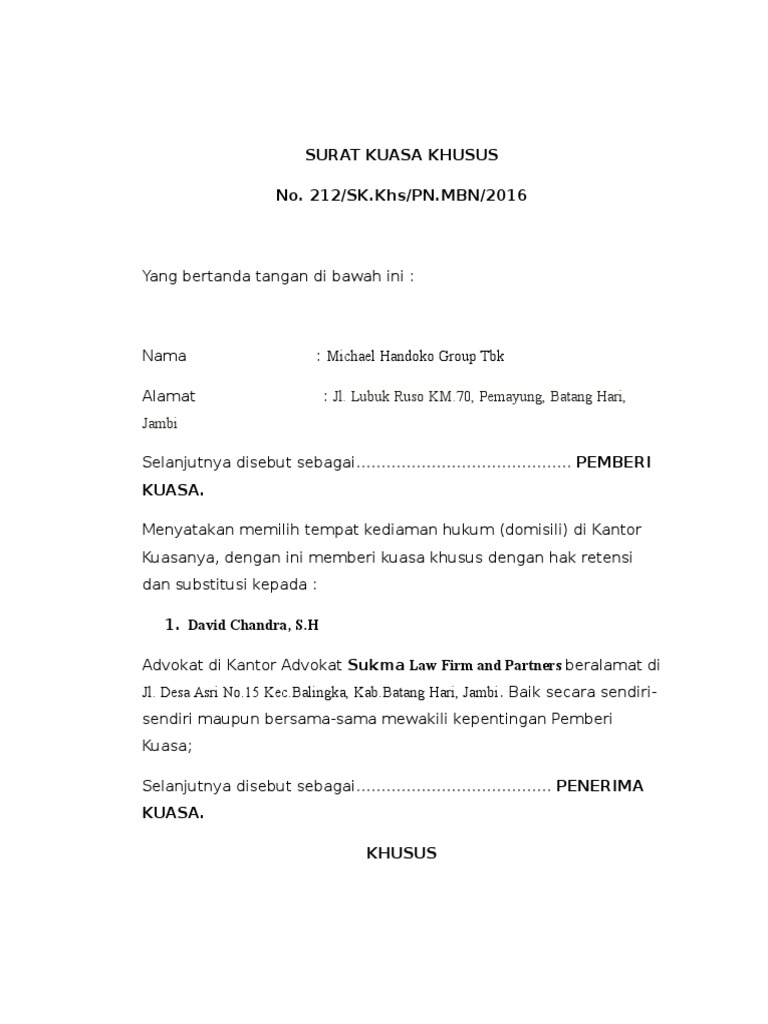 Untuk dan atas nama pemberi kuasa mendampingi dan atau mewakili pemberi kuasa dalam membela dan mempertahankan segala hak dan kepentingan hukum pemberi kuasa di pengadilan tata usaha negara medan atas diterbitkannya surat mutasi dengan no. Perbuatan melawan hukumwanprestasi sesuai dengan kualifikasi hukumnya sebagaimana ternyata dari surat gugatan tertanggal 22 juni 2013 dengan segala akibat hukumnya untuk di dalam persoalan tersebut mewakili pemberi kuasa mengajukan dan menandatangani jawaban dan atau rekonvensi duplik kesimpulan ke hadapan pengadilan negeri kelas ia bale bandung menghadap. Oleh karena itu di artikel ini saya akan menjelaskan secara mendetail tentang contoh surat kuasa. Surabaya jawa t imur telp. Contoh surat kuasa pidana kantor advokat dan konsultan hukum ria rachman rr dan rekan jl. Kawan setia teknik di jl.