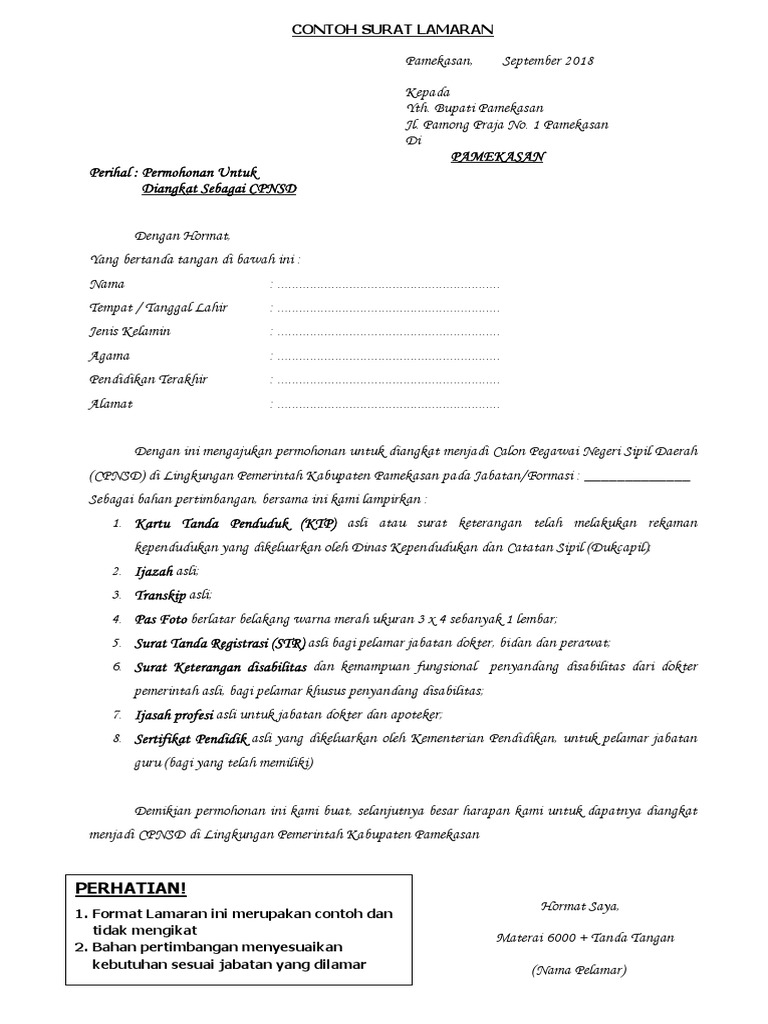 Contoh surat lamaran cpns 2019 resmi untuk guru bumn dan pemda. Ayo di download contoh surat lamaran pernyataan cpns 2018juga contoh dokumen persyaratan dan pengumuman alokasi formasi cpns 2018. Bagi pelamar cpns kemenag 2019 yang ingin mengunduh contoh surat lamaran di atas dalam format pdf bisa men download nya melalui tautan ini contoh surat lamaran cpns 2019 untuk instansi kemenag ada pada bagian lampiran. Sebelumnya memang sudah saya bagikan untuk contoh surat pernyataan cpns guru. Memang tentu saja tidak bisa digunakan secara langsung karena surat lamran cpns harus dibuat dengan tulisan tangan bukan hasil print out dari ketikan. Daftar online cpns pendaftaran cpns kementerian hukum dan ham terbaru format terbaru contoh surat lamaran slta d3 d3 papua s1 s1 papua di cpns kementerian hukum dan ham tahun 2017 pendaftaran calon pns tahun 2017 sudah dibuka pada hari selasa lalu yaitu instansi kementerian hukum dan ham yang mana membuka penerimaan sebanyak 17962 formasi.