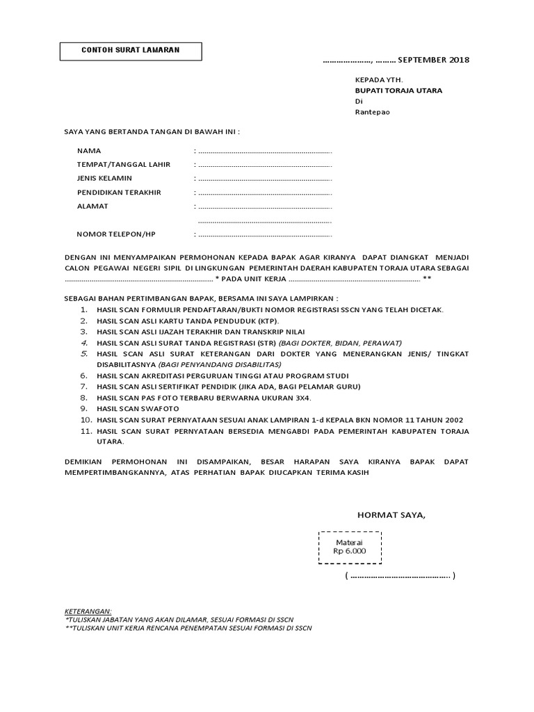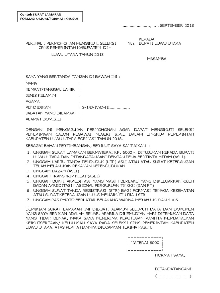 Contoh surat lamaran cpns 2018. Contoh surat lamaran cpns umum. Membuat surat pernyataan dalam melamar cpns bagi yang belum pernah memang sedikit susah. Bagi anda yang akan melamar formasi cpns 2018 di provinsi banten maka silahkan gunakan format surat lamarn ini untuk dijadikan contoh yang resmi untuk anda. Setelah memahami berbagai persiapan di atas berikut ini contoh surat lamaran cpns yang bisa anda tiru. Silahkan dibaca melalui link ini karena terdapat juga informasi penting lainnya. Ayo di download contoh surat lamaran pernyataan cpns 2018juga contoh dokumen persyaratan dan pengumuman alokasi formasi cpns 2018.