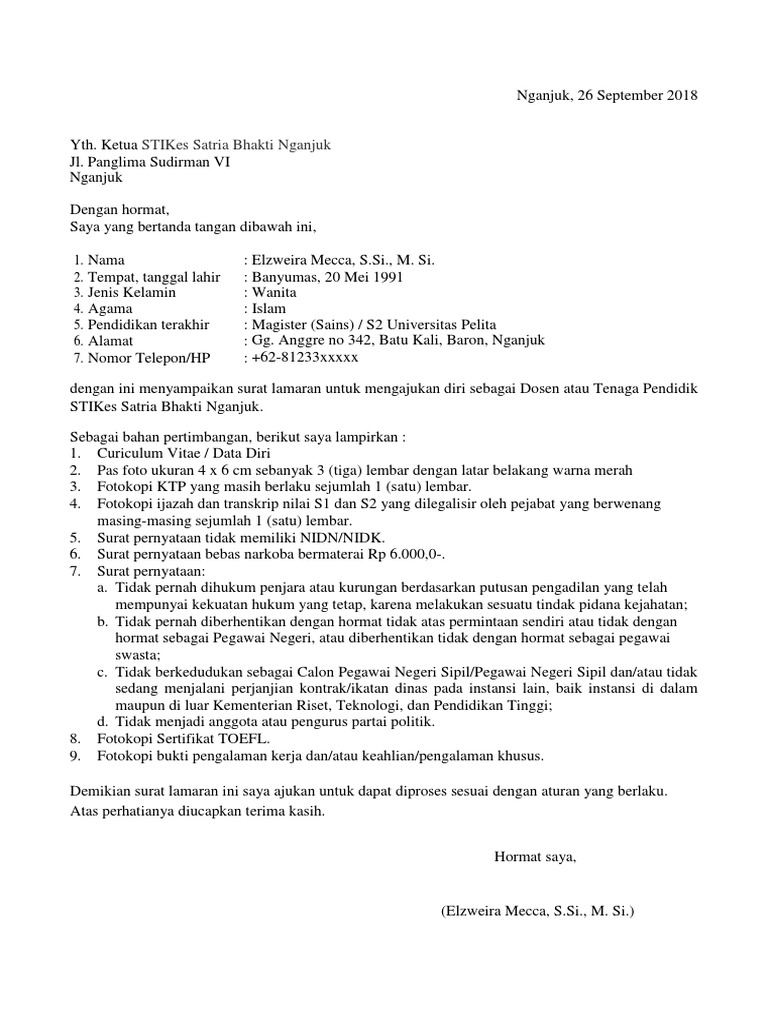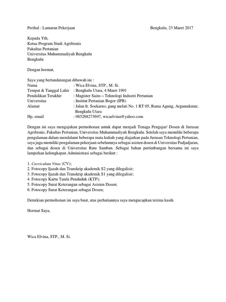 Dosen non pns universitas tidar tahun 2018 surat lamaran yang ditulis tangan dengan huruf latin menggunakan tintahitam. Home surat lamaran kerja contoh surat lamaran asisten dosen yang baik contoh surat lamaran asisten dosen yang baik seorang dosen selain kesibukannya untuk mengajar di kelas dosen juga memiliki segudang kegiatan seperti penelitian dan sebagainya yang terkadang menyebabkan dosen tersebut tidak memiliki waktu lagi untuk memberikan materi perkuliahan. Contoh surat lamaran kerja dosen dosen termasuk salah satu pekerjaan bergengengsi. Itu tadi penjelasan singkat mengenai contoh surat lamaran kerja dosen yang dapat kami berikan pada kesempatan kali ini. Atas perhatianya diucapkan terima kasih. Yaitu dunia baru yang pasti dilalui seorang mahasiswa setelah menyelesaikan studinya.
