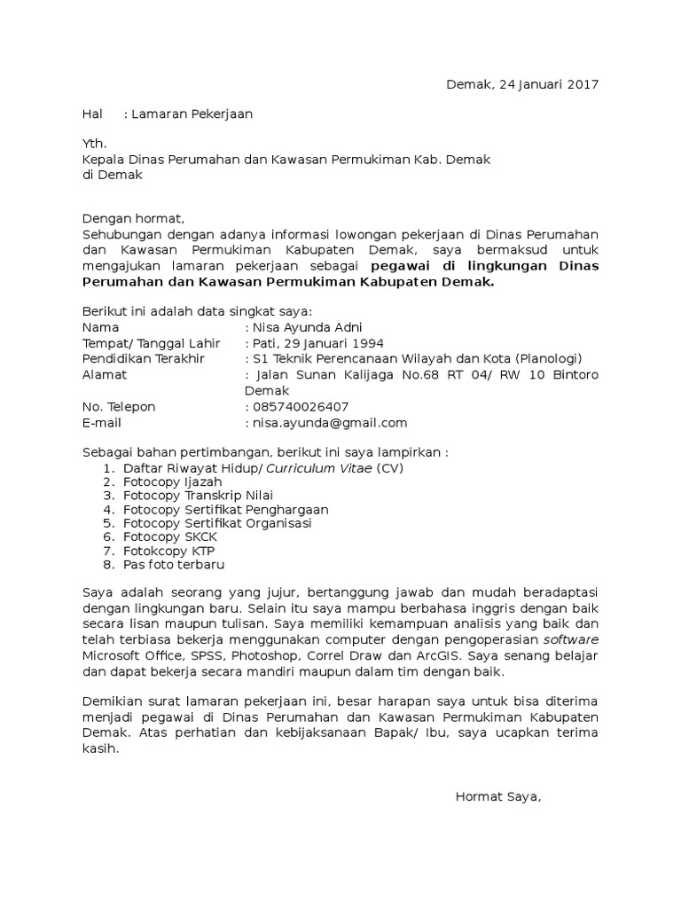 Kamis januari 17 2013 8 comments palu 10 mei 2012. Contoh surat lamaran kerja ketika hendak melamar pekerjaan menjadi karyawan di berbagai instansi manapun pasti hal yang pertama dilakukan pelamar adalah membuat surat lamaran pekerjaan. Contoh surat lamaran kerja honorer dinas perhubungan berbagai posisi sebagai contoh membuat surat lamaran yang baik agar lamaran diterima. Contoh surat lamaran kerja berikut contoh surat lamaran pekerjaan yang bisa kamu download file dokumennya. Surat lamaran kerja adalah surat yang digunakan untuk melakukan permohonan mendapatkan pekerjaan sesuai pengalaman pada perusahaan tertentu. Seringkali suatu instansi perusahaan meminta surat lamaran dalam versi doc ataupun tulis tangan.