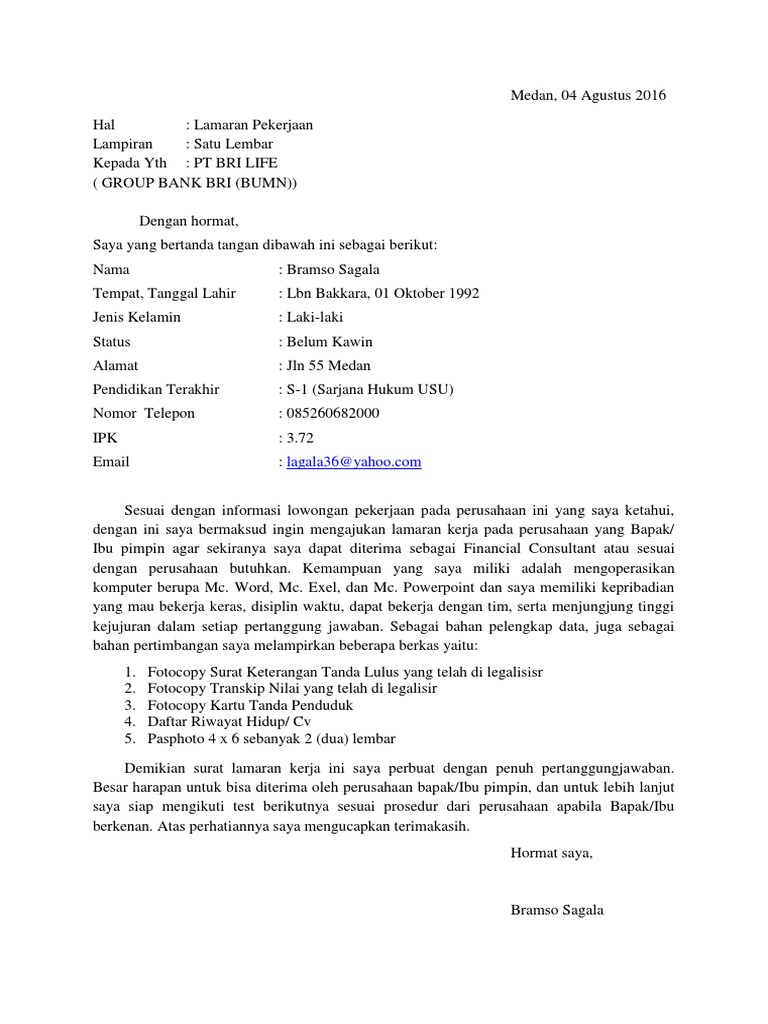 Contoh surat lamaran kerja bank bri tidak jauh berbeda dengan surat lamaran lainnya. Namun sebelum itu pada postingan sebelumnya admin sudah membagikan contoh surat lamaran kerja di bank bri. Namun bagi anda yang pemula atau sama sekali belum pernah membuat surat lamaran kerja akan merasa kebingungan. Yogo indra pangestu sh. Contoh surat lamaran kerja di bank bni adalah surat lamaran kerja terbaru yang akan admin bagikan pagi ini. Contoh surat lamaran kerja di bank sebenarnya tidak jauh berbeda dengan surat lamaran kerja pada umumnya.