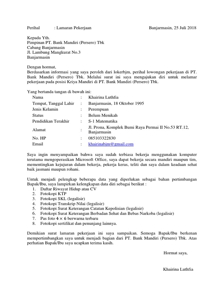 Jalan a yani 32 kudus pendidikan terakhir. Bandar lampung 23 november 2019. Traveloka group di tempat. S1 akuntansi telepon. Mohon maaf apabila terdapat kesamaan namatempatinformasi lain karena surat yang dibuat hanya bertujuan sebagai percontohan tanpa ada maksud apapun. Contoh surat lamaran kerja di bank mandiri bekerja di bank mungkin bagi sebagian orang merupakan salah satu impian.