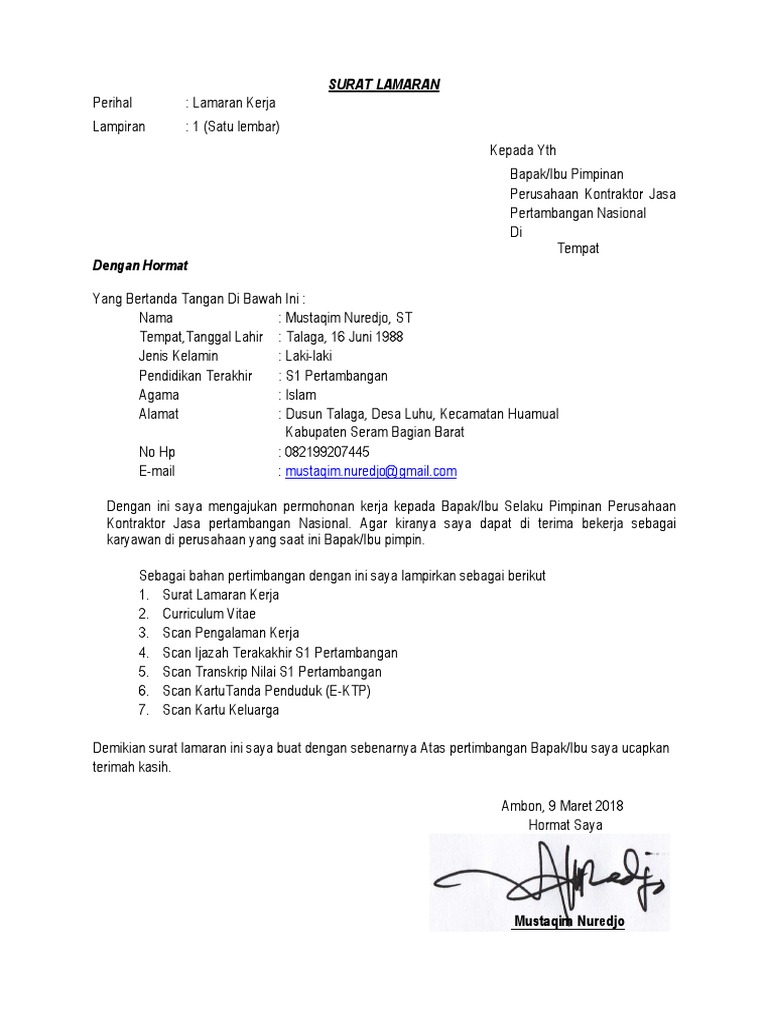 Contoh surat lamaran kerja di perusahaan. Nah jika anda juga berencana melamar pekerjaan di perusahaan maka contoh surat lamaran kerja di persuahaan yang akan saya bagikan di bawah ini patut anda simak. Tempat dan tanggal penulisan 2. Contoh surat lamaran kerja ini saya buat kepada para pencari kerja agar bisa digunakan untuk melamar pekerjaan diperusaaan sesuai dengan posisi yang dibutuhkan oleh perusahan yang sedang membuka lowongan pekerjaan. Dulu surat lamaran kerja memang selalu dikirimkan lewat pos atau diantar langsung ke perusahaankantor. Apakah kamu sedang mencari contoh surat lamaran kerja bahasa inggris cover letter misalnya karena ingin melamar kerja ke perusahaan multinasionalmeskipun proses mencari pekerjaan sudah terjadi sejak lama namun tak banyak orang yang dapat membuat surat lamaran pekerjaan yang baikhal ini karena kurangnya pembekalan bagi mahasiswa dalam hal persiapan untuk melamar pekerjaan ke sebuah. Contoh surat lamaran kerja pada artikel ini kita akan membahas contoh surat lamaran pekerjaan yang dapat kamu dapatkan beserta file doc nya.