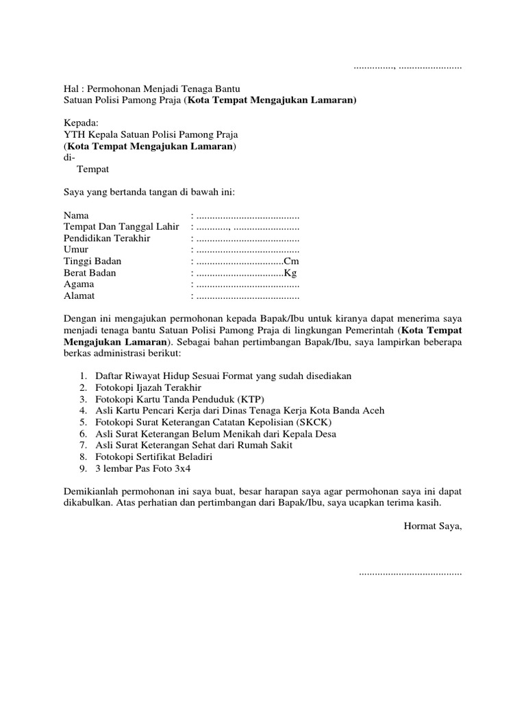Contoh surat lamaran kerja satpol pp. Jika anda ingin membuat surat lamaran pekerjaan yang akan dikirim melalui e mail anda harus men scan terlebih dahulu berkas anda buat menjadi satu folder dengan ukuran maksimal 300kb atau sesuai kriteria yang diminta oleh perusahaan. Itu tadi merupakan contoh surat lamaran kerja yang bisa anda gunakan untuk membuat surat lamaran kerja dengan cara tulis tangan maupun dengan ketik komputer. Surat lamaran kerja benar benar merupakan hal kebutuhan utama bagi kita para pencari kerja untuk mendapatkan pekerjaan yang layak apakah dari kita yang baru saja wisuda kuliah pindah kerja dari perusahaan lain mencari suasana yang baru ataupun. Contoh surat lamaran kerja satpol pp brainly co id news pemerintah kabupaten pacitan 7 contoh surat lamaran kerja yang baik dan benar lengkap lowongan kerja cpns badan perencanaan pembangunan nasional pusat surat lamaran kerja umum contoh surat lamaran kerja ind2906. Contoh surat permohonan satpol pp. Contoh surat lamaran kerja satpol pp contoh surat lamaran kerja contoh surat permohonan lama.