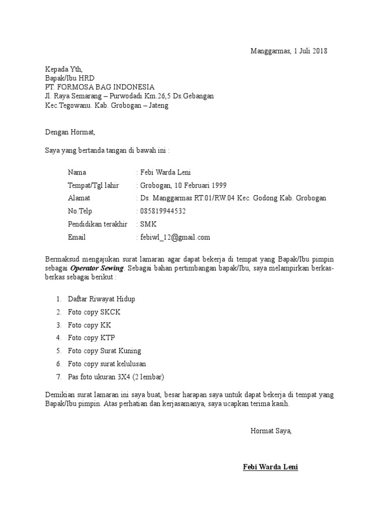 Demikian surat lamaran ini saya buat sesuai dengan kondisi saya yang sebenar benarnya. Berikut data singkat saya. Dengan hormat sesuai dengan adanya informasi lowongan pekerjaan sebagai staff produksi di pabrik tahu bundar. Contoh surat lamaran kerja di pabrik garment adalah contoh surat lamaran pekerjaan terbaru yang akan saya share di siang hari ini. Atas perhatian dan kerjasamanya saya sampaikan banyak terima kasih. Namun seperti yang kita tahu saat ini mencari pekerjaan yang pas dan sesuai dengan keinginan kita tidaklah mudah.