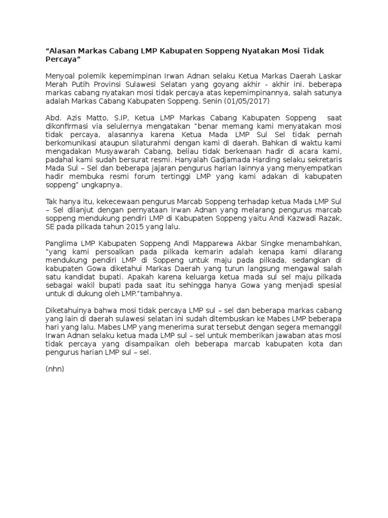 Kb mosi yang menyatakan tidak percaya atas hasil kerja pemerintah. Surat pernyataan mosi tidak percya kepada. Kami yang bertanda tangan di bawah ini atas nama anggota puk sp kep fspsi ssm menyatakan yang sebenar benarrnya bahwa kami sudah tidak mempercayai kepengurus puk sp kep fspsi ssm di karnakan telah tidak dapat memperjuangkan hak hak kami sebagai anggota puk sp kep fspsi ssm dan karyawan pt trans dana profitri tdp. Mosi tidak percaya. Walaupun tidak ada peraturan yang secara tegas menyebutkan tentang mosi tidak percaya namun ada beberapa peraturan yang mengatur mengenai hak menyatakan pendapat atas ketidakpercayaan terhadap pemerintah. Pengurus puk sp kep fspsi ssm.