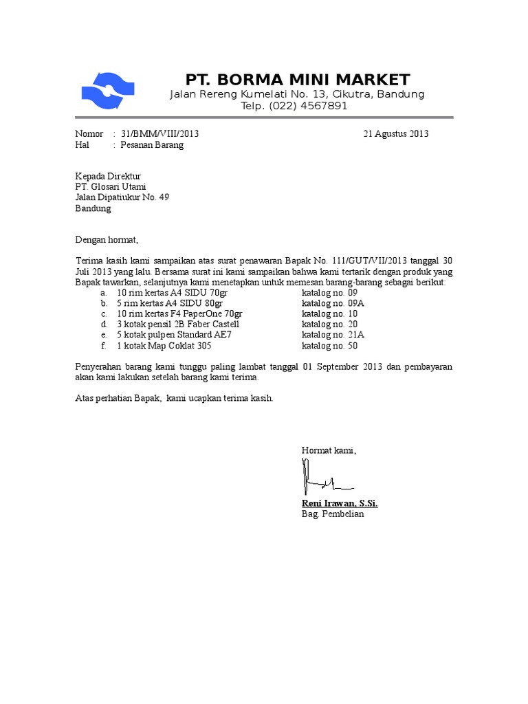 15 contoh surat pesanan barang yang baik dan benar dalam menjalankan sebuah perusahaan tentu ada banyak contoh dan jenis surat yang digunakan. Contoh surat pemesanan barang surat pemesanan barang merupakan salah satu bentuk surat resmi yang diterbitkan oleh pembeli yang berisi tentang permintaan pembelian suatu barang tertentu yang ditujukan kepada pihak lainnya yang menjual barang baik itu perorangan maupun mewakili perusahaan. Contoh surat pemesanan barang jika pada artikel sebelumnya teleh kita bahas mengenai surat penawaran barang maka kali ini yang akan kita bahas adalah kebalikan dengan materi tersebut yaitu mengenai surat pemesanan barang. Contoh surat pesanan surat pesanan barang merupakan salah satu surat yang dibuat oleh pihak pembeli dengan tujuan pembelian kepada penjual. Surat pesanan barang ini termasuk ke dalam surat resmi dan seringkali dipergunakan oleh setiap perusahaan. Tapi pernahkan anda berpikir bagaimana jika instansi atau perusahaan yang melakukan pemesanan.