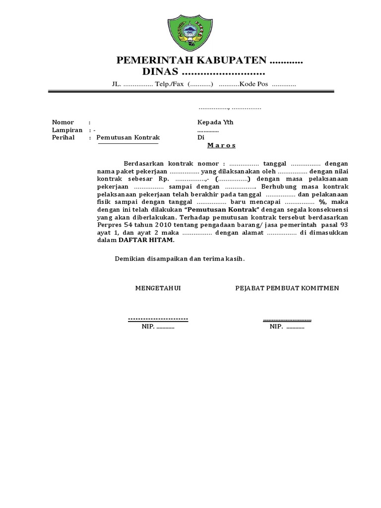 Contoh surat pemutusan kontrak. Tentu saja karyawan yang sudah bekerja dengan baik dan menunjukkan loyalitas pada perusahaan tentunya tidak mengharapkan mendapat surat pemutusan hubungan kerja. Contoh surat pemutusan hubungan kerja karyawan surat pemutusan hubungan kerja. Pemutusan kontrak dilakukan dengan mengacu pada perpres nomor 54 tahun 2010 tentang pengadaan barangjasa pemerintah lampiran iii bagian c2 butir 4 serta permen pu nomor 07prtm2011 tentang standar dan pedoman pengadaan pekerjaan konstruksi dan jasa konsultasi buku 01a bagian b6 butir 385 yang menyatakan bahwa dalam hal pemutusan kontrak dilakukan karena kesalahan penyedia jasa. Surat pemutusan hubungan kerja. Itulah contoh surat pemutusan kontrak sewa gedung yang dapat admin kumpulkan. Academiaedu is a platform for academics to share research papers.