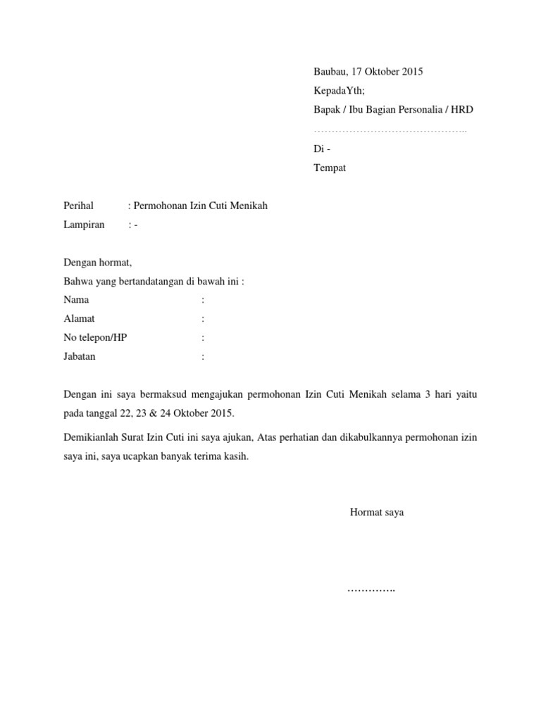 Sekian informasi yang dapat admin sampaikan mengenai contoh surat permohonan izin cuti menikah resmi kepada atasan untuk data yang ada bisa disesuaikan dengan data diri anda serta bisa disempurnakan lagi jika anda mempunyai konsep yang lebih bagus. Syaratnya tentu mahasiswa yang bersangkutan harus membuat dan mengajukan contoh surat permohonan cuti kuliah. Surat permohonan cuti bisa diajukan jika syarat untuk mendapatkan cuti sudah terpenuhi tentunya. Contoh surat izin cuti pdf. Pengambilan cuti sementara ini dipersiapkan untuk para perempuan agar bisa menyiapkan proses persalinan tanpa harus memikirkan beban pekerjaan. Beberapa hal umum yang mendasari seorang karyawan untuk mengambil cuti antara lain karena sakit mempunyai kewajiban atau kegiatan di luar kota sedang dalam periode kehamilan atau.