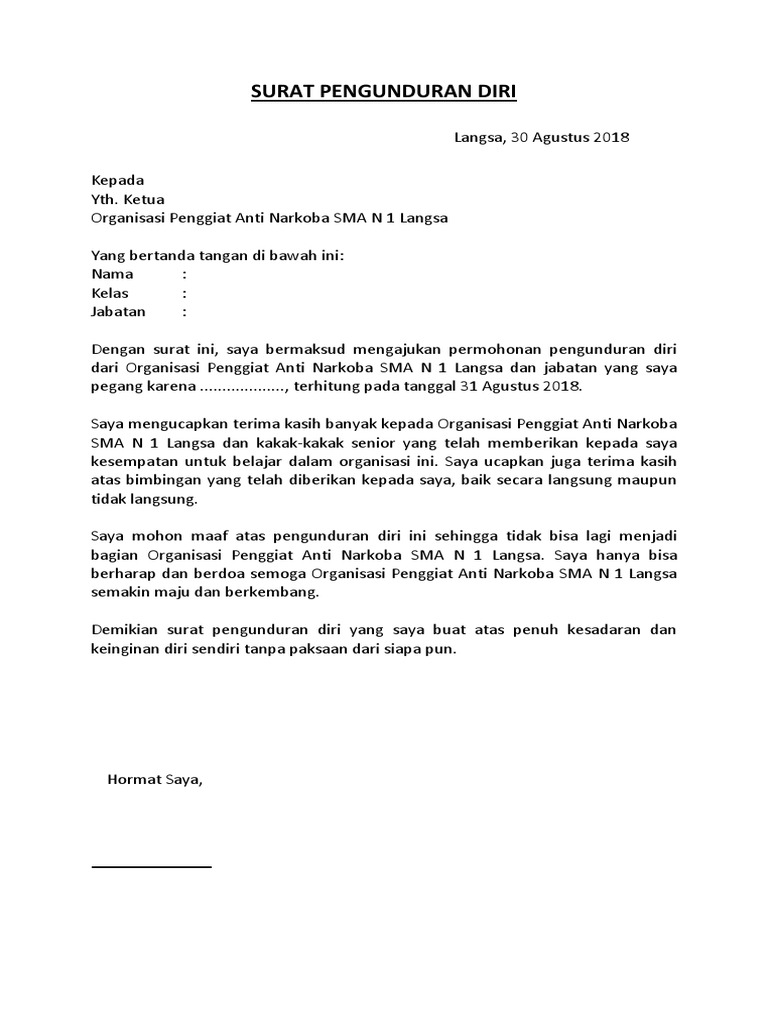 Ketika anda membuat surat ini anda harus memperhatikan tentang kaidah atau aturan aturan di dalam pembuatan surat resmi seperti dengan mencantumkan kop surat tanggal dan lain sebagainya seperti halnya ketika anda membuat contoh surat pemberitahuan dinas sekolah kegiatan kampus dan kegiatan rt paling lengkap atau juga contoh surat pengunduran diri organisasi. Dan semuanya itu tentu bukanlah hal yang mudah bagi sebagian orang. 15 contoh surat pengunduran diri dari organisasi paling lengkap keputusan untuk mengundurkan diri dari suatu perkumpulan atau kelompok tentu merupakan keputusan yang besar dan bisa memberikan dampak tertentu terhadap diri anda sendiri. Begitulah contoh surat pengunduran diri dari organisasi biasanya lebih panjang dari pada surat resign kerja. Contoh surat pengunduran diri atau contoh surat resign yang baik dan benar. Mengundurkan diri dari sebuah organisasi adalah sebuah keputusan yang sangat besar dan untuk merealisasikan keputusan yang sudah dibuat tentu kita harus membuat surat pengunduran diri yang baik.