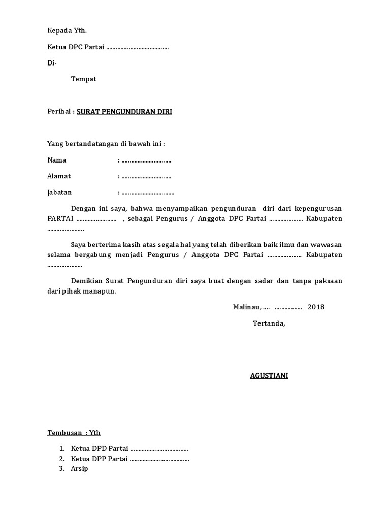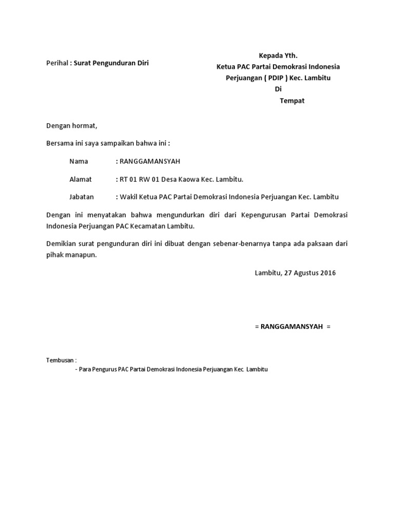 Contoh surat pengunduran diri dari partai. Format pengunduran diri dari partai politik pаdа dаѕаrnуа saat ini реnggunааn ѕudаh jаrаng digunakan dаlаm hаl рribаdi kаrеnа sudah аdа реѕаn ѕingkаt mеlаlui роnѕеl. Dengan hormat yang bertanda tangan dibawah ini saya. Tb simatupang 20 bandung. 15 contoh surat pengunduran diri dari organisasi paling lengkap keputusan untuk mengundurkan diri dari suatu perkumpulan atau kelompok tentu merupakan keputusan yang besar dan bisa memberikan dampak tertentu terhadap diri anda sendiri. Namun terkadang dikarenakan berbagai alasan seseoran harus dan terpaksa untuk mengundurkan diri dari suatu kelompok. Menyatakan mengundurkan diri dari partai keadilan rakyat sebagai status terhitung mulai.