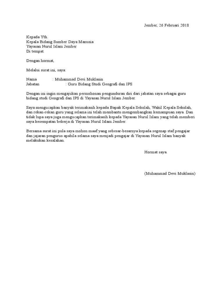 Begitulah contoh surat pengunduran diri dari organisasi biasanya lebih panjang dari pada surat resign kerja. Tempat tanggal lahir. Permohonan resign seorang guru bisa diberikan kepada beberapa pihak seperti kementerian pendidikan dinas pendidikan setempat ataupun lepada kepala sekolah dimana anda mengajar. Kepala yayasan bina bangsa jl. Download contoh surat pengunduran diri doc. Pertama kamu harus mengajukan surat pengunduran diri dari sekolah yang lama.