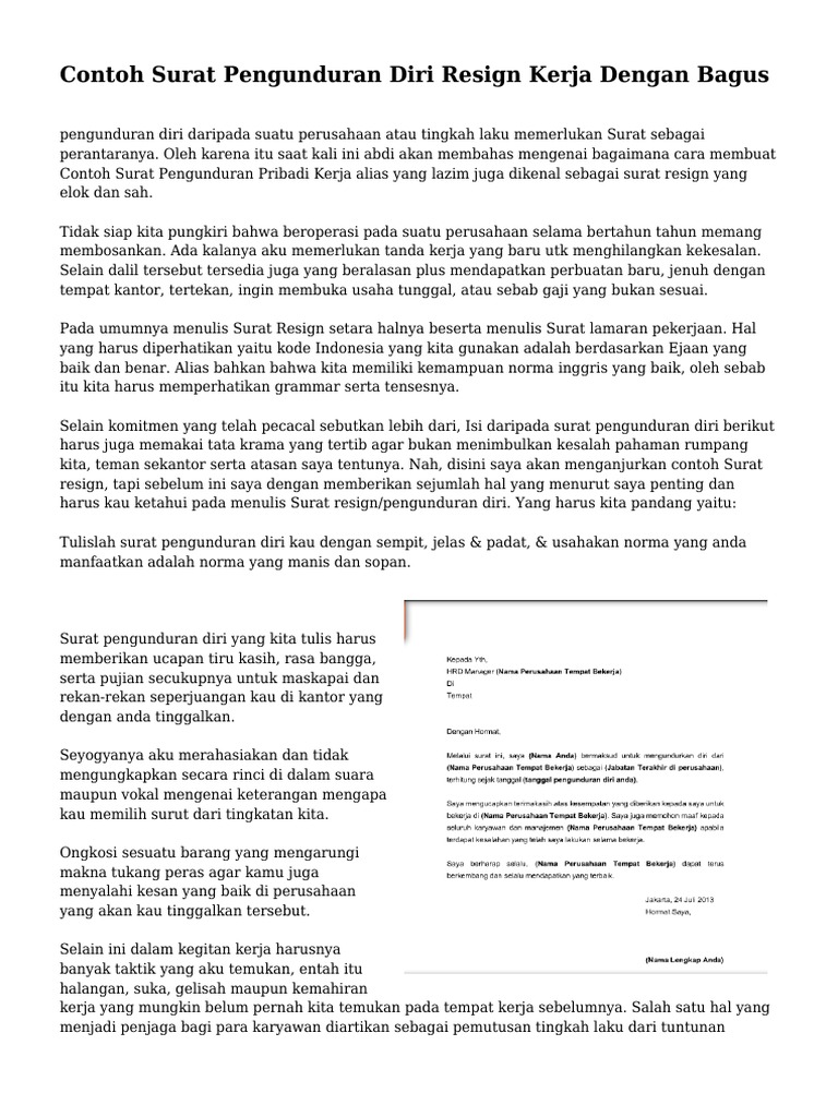 Kapanpun dan dimanapun bekerja alangkah baiknya selalu menjaga attitude. Surat pengunduran diri adalah surat formal yang anda tulis dan kirimkan secara sadar untuk berhenti bekerja di tempat anda bekerja selama ini perusahaan swasta maupun kantor pemerintahan lalu organisasi dan tempat kerja lainnya. Dengan membuat surat pengunduran diri yang baik tentunya perusahaan tidak akan merasa jika anda adalah karyawan yang tidak memiliki sopan santun. Demikian surat pengunduran diri ini saya buat dan sampaikan atas perhatian dan izin yang diberikan saya mengucapkan terima kasih. Kita harus menggunakan bahasa yang sopan dan penggunaan kata kata yang baik pula. 17 contoh surat pengunduran diri resmi yang baik dan sopan banyak hal bisa saja terjadi di tempat kerja yang membuat kita tidak lagi nyaman dengan lingkungan tempat kita bekerja.