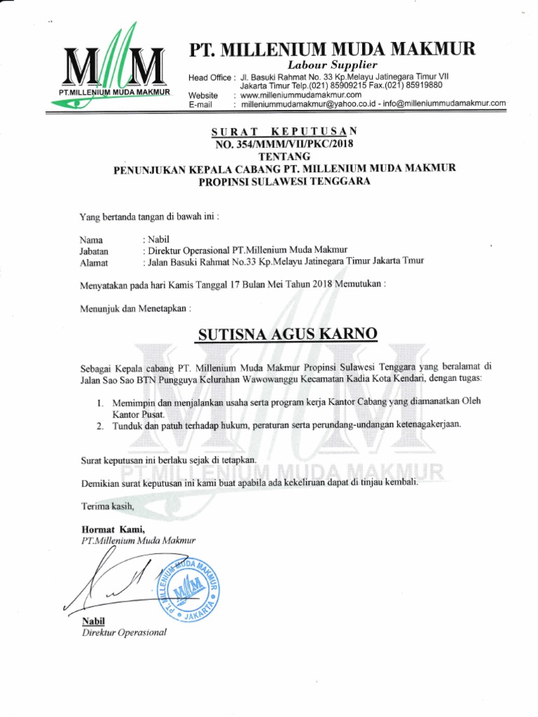 Contoh surat penunjukan membuka kantor cabang. Contoh surat penunjukan surat penunjukan memiliki fungsi sebagai kuasa untuk memberikan wewenang dan tugas tertentu kepada salah satu pihak yang masih dalam ruang lingkup kerja yang sama. Duta rajawali motor sebuah perseroan terbatas yang beralamat di jl. Fachrudin direktur bertindak untuk dan atas nama pt.