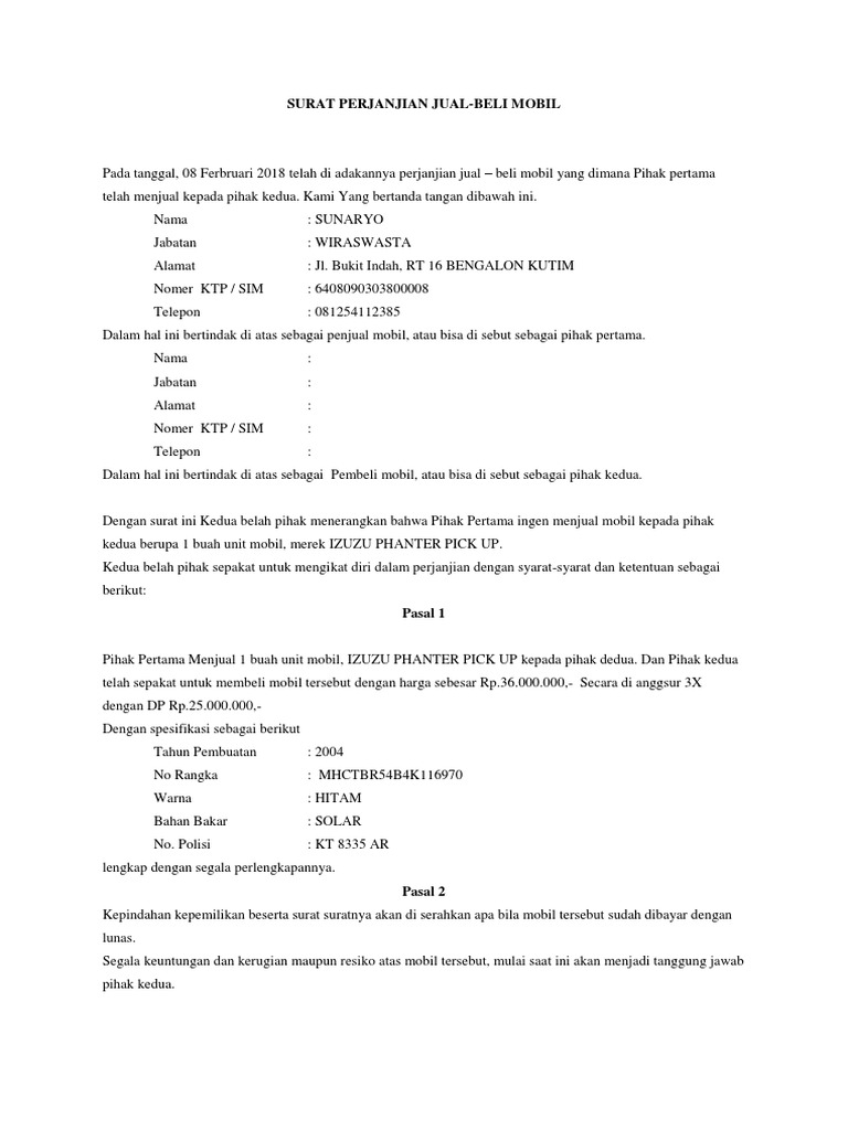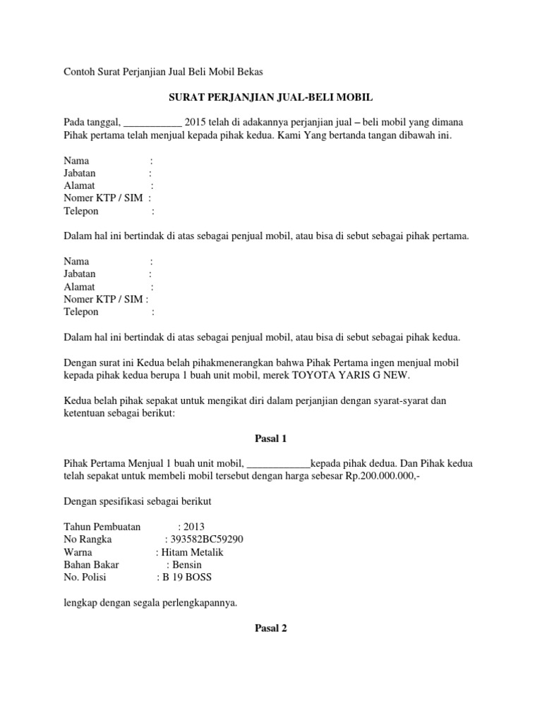Surat jual beli mobil bekas tidak jarang bagi konsumen untuk membuat kesalahan dengan menandatangani kontrak tanpa membacanya terlebih dahulu. 4 contoh surat perjanjian jual beli motor untuk penjual dan pembeli surat perjanjian jual beli motor merupakan surat yang berisi informasi tentang transaksi dan ketentuan ketentuan yang ada di dalam proses transaksi jual beli tersebut seperti menjelaskan objek dan biaya yang dikeluarkan untuk membeli objek yang dijualbelikan.