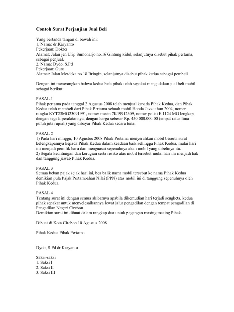 Perjanjian jual beli ini umumnya di buat oleh penjual mobil yang ingin menjual mobilnya pada calon pembeli. Dalam proses transaksi jual beli rumah maupun jual beli apapun yang memiliki nilai jual tinggi sebaiknya digunakan contoh surat perjanjian jual beli rumah dengan 11 pasal berikut ini. Perjanjian jual beli mobil pada postingan sebelumnya saya sudah memberikan contoh contoh surat yang berhubungan dengan syarat formil dalam beracara di pengadilan. Contoh surat perjanjian jual beli mobil bekas memang harus di buat sedetil mungkin agar tidak terjadi kesalahpahaman antara penjual dan pembeli di kemudian hari. Surat perjanjian jual beli mobil. Hal ini bertujuan untuk mencegah hal hal yang tidak diinginkan menghindari sengketa dan mengikat kedua belah pihak yaitu penjual dan pembeli untuk terikat dan bertanggung jawab atas proses jual beli.