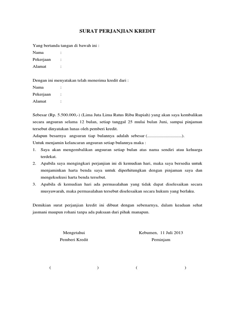 Contoh surat perjanjian kredit surat perjanjian kredit merupakan sebuah surat yang berisi sebuah perjanjian kesepakatan antara debitur dengan kreditur dalam hal ini bank yang melahirkan hubungan hutang piutang dimana debitur berkewajiban membayar kembali pinjaman yang diberikan oleh kreditur dengan berdasarkan syarat dan kondisi yang telah disepakati oleh para pihak. Surat permohonan kredit kebanyakan bagi mereka yang sedang menjalani sebuah usaha bisnis apabila sedang mengalami masalah keuangan salah satu solusi yang sering dilakukan oleh pelaku bisnis yaitu menganjukan kredit kepada sebuah lembaga keuangan seperti bank koperasi atau lembaga simpan pinjam lainnya.