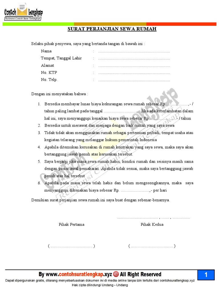 Contoh surat perjanjian kontrak rumah memiliki rumah sebagai tempat tinggal tentu harus memiliki juga surat surat sebagai bukti kepemilikian. Proses kontrak rumah harus melalui prosedur tertentu. Tuan rumah akan mengembalikan wang cagaran kepada penyewa pada hari penghujung penyewaan ini tertakluk kepada syarat syarat dimana wang cagaran boleh digunakan oleh tuan rumah bagi menjelaskan sewa rumah yang tertunggak. Untuk anda yang ingin mengontrak rumah atau malah mungkin yang mengontrakkan yg punya rumah sebaiknya gunakan contoh surat perjanjian kontrak rumah atau sewa rumah ini sebagai bagian dari kesepakatan kontrak atau sewa rumah. Identitas pihak pertama dan pihak kedua identitas lengkap termasuk nama lengkap umur pekerjaan hingga nomor ktp oleh kedua belah pihak. Rumahcom contoh surat perjanjian sewa rumah ini tentunya akan sangat berguna bagi anda baik sebagai pemilik rumah atau sebagai pengontrak.
