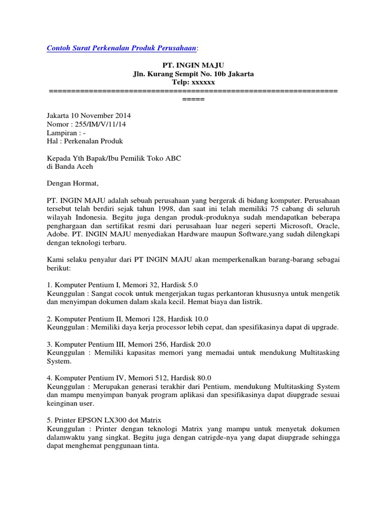 Contoh surat perkenalan produk. Salah satu contoh surat yang sering dipergunakan adalah surat perkenalan produk atau barang. Hanya saja pada surat ini posisi kita lah yang bertindak sebagai pengirim surat ke suatu perusahaan dan meminta mereka melakukan penawaran barang yang mereka miliki ke perusahaan kita. Contoh surat perkenalan produk dalam menjalankan bisnis atau perniagaan tentu ada banyak jenis jenis surat yang dipergunakan. Banyak perusahaan perusahaan besar yang dengan mudah memperkenalkan diri maupun memperkenalkan produk ke pihak lain yakni dengan cara memasang iklan. 15 contoh surat perkenalan produk dan jasa perusahaan seiring dengan kemajuan zaman dan kecanggihan teknologi sekarang ini pihak perusahaan memang sangat mudah untuk memperkenalkan perusahaan mereka maupun produk yang mereka miliki. Contoh surat dan format penulisannya yang benar surat perkenalan perusahan merupakan sebuah surat resmi yang dibuat untuk memberikan informasi mengenai produk barang dan jasa yang ingin ditawarkan kepada perusahaan lainnya sehingga ia mau menjadi rekan kerja.