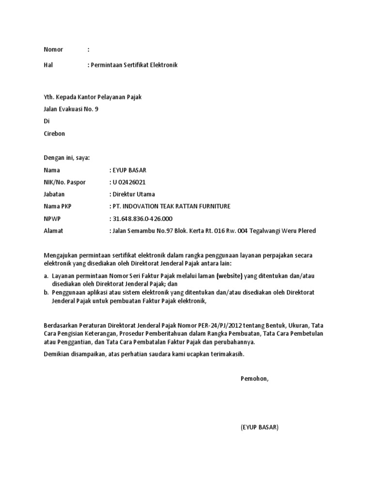 Silahkan download form permintaan sertifikat elektronik dan surat pernyataan persetujuan penggunaan sertifikat elektronik direktorat jenderal pajak dalam word karena peraturan tentang e faktur efektif 1 juli 2015 lampiran ih peraturan direktur jenderal pajak nomor. Sesuai namanya surat permintaan sertifikat elektronik merupakan surat permohonan yang diajukan oleh pengusaha kena pajak pkp kepada kantor pelayanan pajak kpp untuk meminta sertifikat elektronik pajak. Contoh surat permintaan sertifikat elektronik ke dirjen pajak unknown. Yuk pelajari selanjutnya di bawah ini. Surat permintaan sertifikat elektronik dan surat pernyataan persetujuan penggunaan sertifikat elektronik ditandatangani dan disampaikan oleh pengurus pkp yang bersangkutan secara langsung ke kpp tempat pkp dikukuhkan dan tidak diperkenankan untuk dikuasakan ke pihak lain. Pkp mengajukan permohonan berupa surat permintaan sertifikat elektronik dan surat pernyataan persetujuan penggunaan sertifikat elektronik ditandatangani dan disampaikan oleh pengurus pkp yang bersangkutan secara langsung ke kpp tempat pkp dikukuhkan.