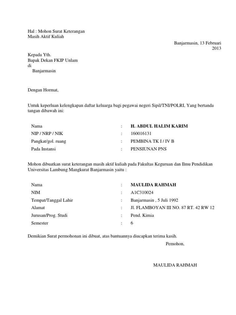 Contoh surat permohonan aktif kuliah. Tapi ada pula di sebagian kampus pihak yang memberikan surat keterangan kuliah ini adalah kepala baak bagian akademik dan administrasi kemahasiswaan. Surat permohonan aktif kuliah juga memiliki unsur unsur yang harus ada dalam surat tersebut seperti yang ada dalam contoh surat yang kami sajikan. Surat keterangan kuliah ini biasanya dikeluarkan oleh dekan fakultas. Created for just one purpose contoh surat aktif kuliah contoh surat aktif kuliah. Karena sebelumnya ia telah menjalani cuti kuliah dalam beberapa waktu dikarenakan alasan tertentu seperti permasalahan kekurangan dana untuk kuliah karena ingin bekerja terlebih dahulu alasan melahirkan orang tua atau alasan lainnya. Namun tetap saja surat ini sangat diperlukan ketika seseorang mahasiswai ingin mengajukan permohonan cuti kuliah apapun yang menjadi alasannya.