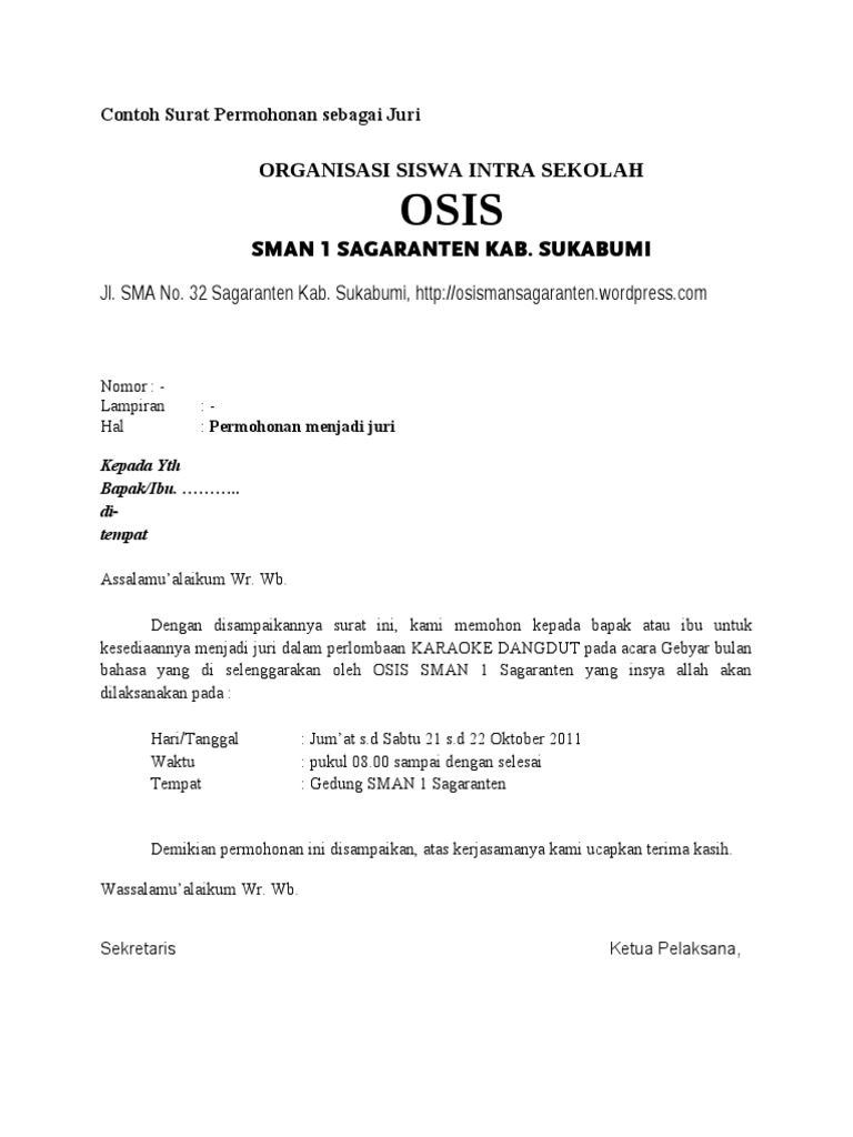 Contoh surat permohonan menjadi juri lomba ini juga bisa anda modif dan rubah sendiri sesuai dengan keperluan anda. Contoh surat permohonan menjadi dewan juri lomba maret 04 2017 remaja masjid darul jannah. Apalagi jika berurusan dengan pembuatan acara kegiatan bakti sosial hingga urusan kedinasan. Itulah informasi mengenai contoh surat undangan juri lomba membuat surat undangan juri lomba. Udah lama ya materi anak pramuka gak ngeposting lagi. Contoh surat permohonan setiap orang pasti pernah mengalami kesulitan entah seberapa matang rencana yang telah dibuat.