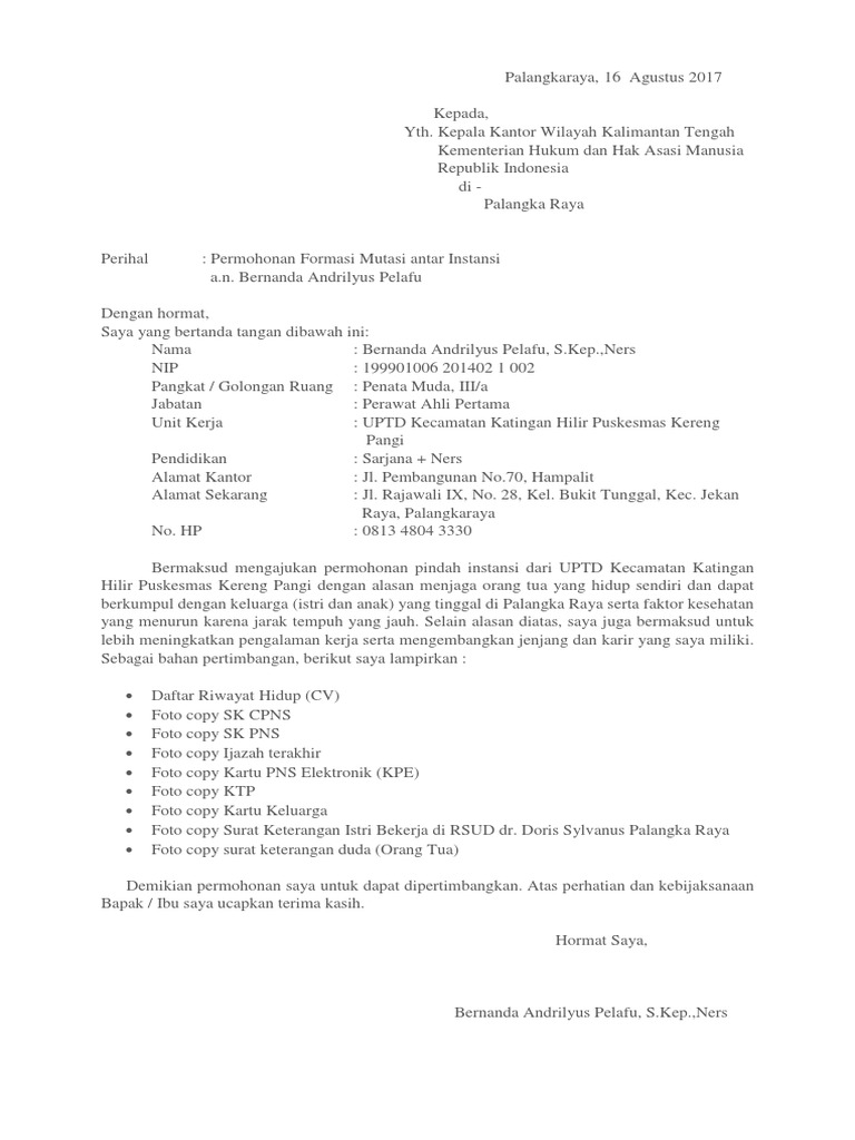 Namun pada beberapa kasus anda pun bisa mengajukan permohonan pindah tugas terutama untuk pns. Perlu diingat surat awal pengajuan mutasi ini dibuat pribadi tanpa kop instansi yang dikirimkan ke institusi yang akan kita tuju. Melengkapi posting sebelumnya tentang tips mutasi pns antar daerah myu blog ingin berbagi informasi khususnya tentang contoh surat permohonan mutasi pns antar instansi lolos butuhseperti yang telah dijelaskan artikel sebelumnya bahwa salah satu yang paling cepat diterima ketika mengajukan mutasi adalah dengan sistem barter. Kepala kementerian agama kota banda aceh di tempat dengan hormat bersama surat ini saya yang bertanda tangan di bawah ini. Untuk setiap instansi mungkin berbeda beda namun pada umumnya harus melampirkan fotocopy sk fotocopy karu pegawai fotocopy ijazah terakhir fotocopy absensi riwayat hidup bahkan surat rekomendasi. Surat permohonan mutasi instansi pusat hakim jaksa.