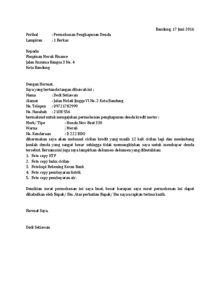 Semoga dapat menjadi contoh referensi dalam membuat surat permohonan penghapusan denda yang baik. Ariss junior location. Inilah pembahasan lengkap terkait contoh surat permohonan penghapusan bunga dan denda bank. Contoh surat permohonan pelunasan dengan keringanan di bank pailit usaha meminjam uang bunga angsur. Beranda artikel contoh surat permohonan keringanan pelunasan kredit bank contoh surat permohonan keringanan pelunasan kredit bank newsberi. Contoh surat permohonan keringanan bunga bank bisa anda dapati disini.