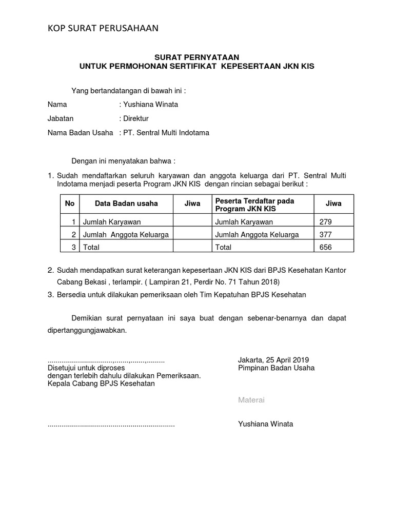 Contoh surat pengantar dari perusahaan ke bpjs kesehatan surat pengantar dari perusahaan biasanya berisi permohonan pendaftaran peserta bpjs ketenagakerjaan atau kesehatan. Di sini admin ingin menyajikan contoh syarat berkas pertama yang diminta dalam permohonan penerbitan sertifikat bpjs kesehatan yaitu surat permohonan penerbitan sertifikat bpjs kesehatan. Contoh surat permohonan sertifikasi kepalakop surat perusahaan tempat tanggal bulan tahun nomor. Itulah contoh surat permohonan cetak kartu bpjs kesehatan perusahaan yang dapat admin kumpulkan. Data data mengenai contoh surat permohonan penambahan peserta bpjs kesehatan. Permohonan sertifikasi sertifikasi ulangperluasan ruang lingkup sertifikat produk penggunaan tanda sni kepada yth.
