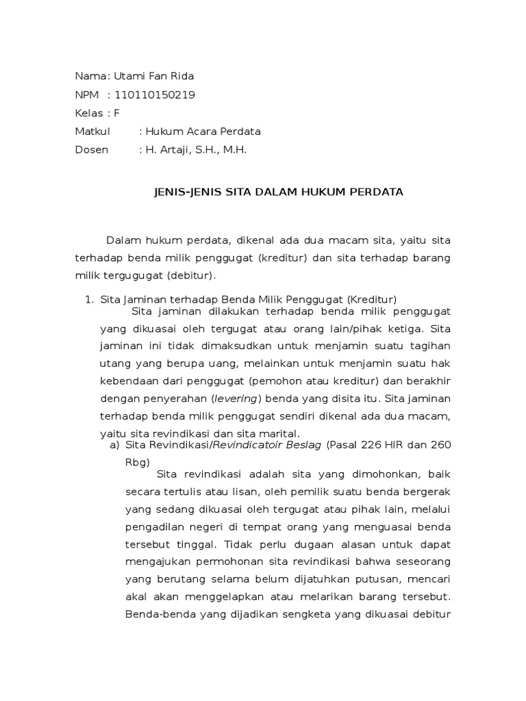 Contoh surat permohonan sita jaminan. Sita conservatoir dan sita revindicatoir penyitaan atau beslag merupakan tindakan persiapan berupa pembekuan barang barang yang berada dalam kekuasaan tergugat sementara waktu untuk menjamin agar putusan sidang pengadilan perdata dapat dilaksanakan. Adalah sita terhadap barang barang milik tergugat yang disengketakan status kepemilikannya atau dalam sengketa hutang piutang atau tuntutan ganti rugi. Sita eksekusi yang tidak langsung adalah sita eksekusi yang berasal dari sita jaminan yang telah dinyatakan sah dan berharga dan dalam rangka eksekusi otomatis berubah menjadi sita eksekusi. Di atas merupakan bagian terpenting dan yang tidak dapat dipisahkan dari akta perjanjian kredit dengan pemberian jaminan surat perjanjian. Sita jaminan conservatoir beslaag ini diatur dalam pasal 227 hir. Kumpulan contoh contoh surat lamaran kerja kontrak jual beli perjanjian.