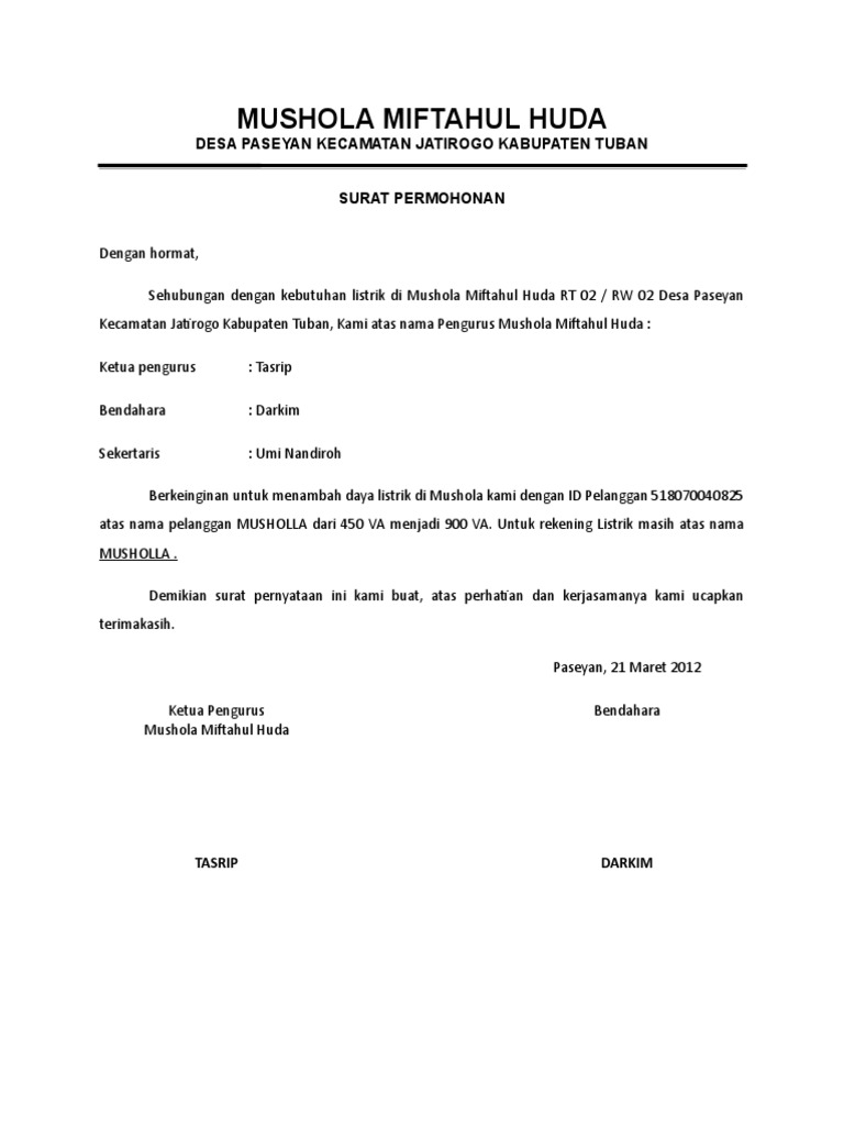Contoh surat permohonan tambah daya listrik. Contoh surat kuasa penambahan daya listrik. Admin dari blog bagi contoh surat 2019 juga mengumpulkan gambar gambar lainnya terkait contoh surat permohonan tambah daya listrik ke pln dibawah ini. Selain penurunan daya listrik penambahan daya listrik juga bias dilakukan penambahan daya listrik biasanya dilakukan karena untuk memenuhi kebutuhan daya listrik dirumah yang kurang memadai. Berkeinginan untuk menambah daya listrik di mushola kami dengan id pelanggan 518070040825 atas nama pelanggan musholla dari 450 va menjadi 900 va. Kali ini penulis akan memberikan sesuatu yang bermanfaat buat kalian semuah yaitu khususnya bagi para wiraswasta yang mau membuka usaha kemudian usahanya sangat membutuhkan aliran listrik maka kebetulan sekali kalau anda sedang bersilaturahmi disini karena postingan kali ini adalah mengenai contoh surat permohonan pemasangan listrik baru. Untuk rekening listrik masih atas nama musholla.