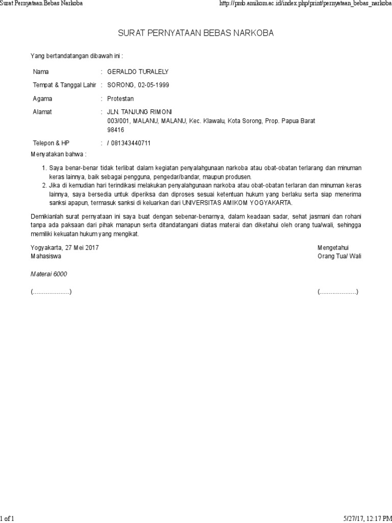 Tempat dan tanggal lahir. Jadi ini berbeda dengan surat keterangan bebas narkoba yang umumnya telah dikeluarkan oleh pihak rumah sakit atau kepolisian. Dengan ini menyatakan dengan sesungguhnya bahwa saya tidak pernah terlibat dalam penyalahgunaan narkotika dan obatbahan berbahaya narkobanapza. Contoh cara membuat surat bebas narkoba syarat pendaftaran cpns 2018 dimana mencari surat bebas narkoba. Di surat pegumuman itu dijelaskan surat pernyataan bebas narkoba diketik menggunakan komputer dan ditandatangani dengan pena berwarna hitam. Terkait dokumen surat pernyataan bebas narkoba syarat cpns 2019 tersebut kemenag pun sudah memberikan contoh maupun formatnya.