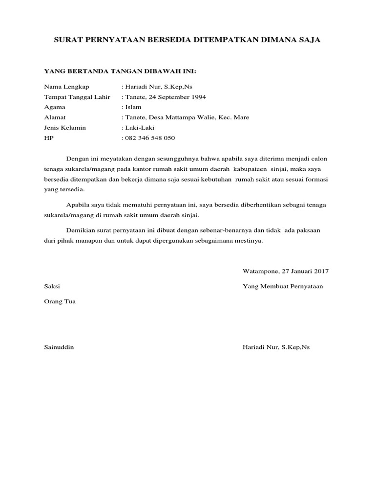 Suka maju 14 juni 1988 agama. Admin blog bagi contoh surat 2019 juga mengumpulkan gambar gambar lainnya terkait surat keterangan bersedia ditempatkan dimana saja dibawah ini. Contoh surat pernyataan bersedia ditempatkan dimana saja di lingkungan kementerian agama kemenag yang akan saya bagikan kali ini tentunya saat ini sedang dicari cari oleh mereka yang ingin mendaftar dalam seleksi penerimaan calon pegawai negeri sipil tahun anggaran 2018. Karena banyak yang komentar bahwa kesulitan mendownload surat pernyataan bersedia ditempatkan dimana saja di seluruh wilayah indonesia cpns kemenkes tahun 2010 berikut saya posting surat pernyataan tersebut. Sebagai pegawai negeri sipil sudah menjadi tugas dan kewajibannya harus mau ditempatkan di mana saja dan diposisi apa saja. Salah satu persyaratan berkas digital yang harus diunggah pada saat mendaftar yaitu surat pernyataan bersedia ditempatkan di mana saja.
