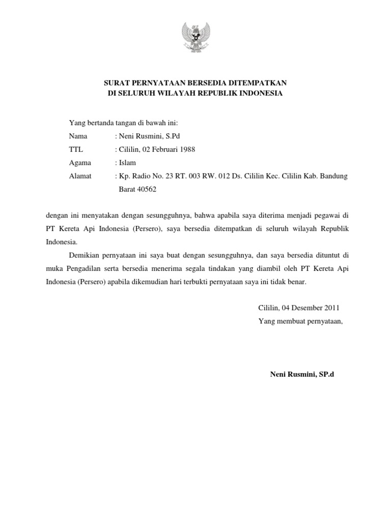 Contoh surat pernyataan kesanggupan ditempatkan dimana saja di pt. Nah pada kesempatan ini kita akan membahas satu buah contoh surat izin yang termasuk juga ke dalam surat pernyataan. Pernyataan satu ini bersifat global jadi kita bisa membuat sebuah pernyataan berdasarkan contoh atau meniru sebuah surat dari agensi lain. Sebagai pegawai negeri sipil sudah menjadi tugas dan kewajibannya harus mau ditempatkan di mana saja dan diposisi apa saja. Contoh surat pernyataan bersedia ditempatkan dimana saja surat pernyataaan bersedia ditempatkan dimana saja biasanya dibuat oleh karyawan baru pada sebuah lembagainstasi bisnis pegawai negeri yang akan mengikuti tes kenaikan pangkat atau anggota wajib militer suatu negara. Contoh surat pernyataan bersedia ditempatkan dimana saja di lingkungan kementerian agama kemenag yang akan saya bagikan kali ini tentunya saat ini sedang dicari cari oleh mereka yang ingin mendaftar dalam seleksi penerimaan calon pegawai negeri sipil tahun anggaran 2018.