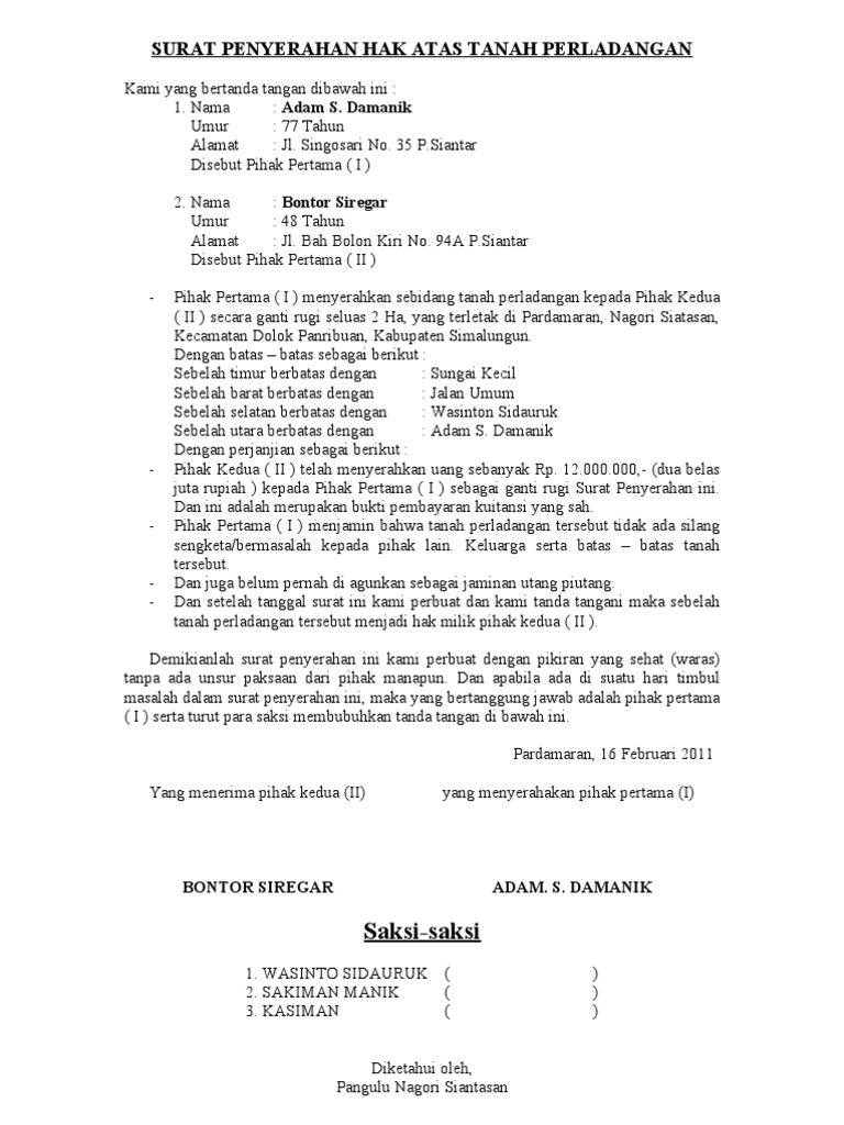 Contoh surat pernyataan penyerahan tanah. Contoh surat pernyataan penyerahan tanah. Dalam surat pernyataan jual beli tanah atau akad jual beli tanah ajb anda akan menemukan serangkaian pasal pasal penting. Biasanya dokumen ini bersifat accecoir dari bukti pernyataan lainnya seperti bukti kepemilikan dan bukti peralihan. Surat pernyataan penyerahan tanah merupakan bukti dokumen bahwa seseorang telah menyerahkan tanah yang dimilikinya kepada pihak lain baik itu melalui jual beli hibah ataupun lainnya. Contohnya untuk tanggungan biaya ketika ingin melakukan balik nama pajak iuran dan biaya lahan lainnya. Surat pernyataan tidak sengketa.