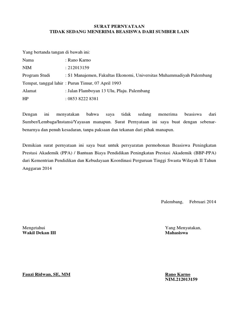 Contoh surat pernyataan tidak menerima beasiswa. Yaps setiap persyaratan pengajuan beasiswa baik itu beasiswa ppa maupun bbm surat pernyataan ini pasti akan dibutuhkan. Apabila terbukti sedang menerima danatau mendaftar beasiswa dari pihak manapun saya bersedia diberhentikan dari program beasiswa unggulan dan mengembalikan dana beasiswa yang sudah saya terima sebesar 2 dua kali lipat kepada kas negara. Para penyedia beasiswa tentu akan selektif dalam memberikan beasiswa kepada siswa atau mahasiswa. Manapun dan tidak sedang mendaftar beasiswa pihak manapun. Contoh surat pernyataan pernyataan bisa dilakukan secara lisan maupun non lisan atau tertulis. Contoh surat pernyataan tidak menerima bantuan beasiswa pemberi beasiswa baik itu dari sekolah kampus pemerintah maupun perusahaan biasanya memberikan beasiswa bagi pelajar mahasiswa yang tidak sedang menerima beasiswa.
