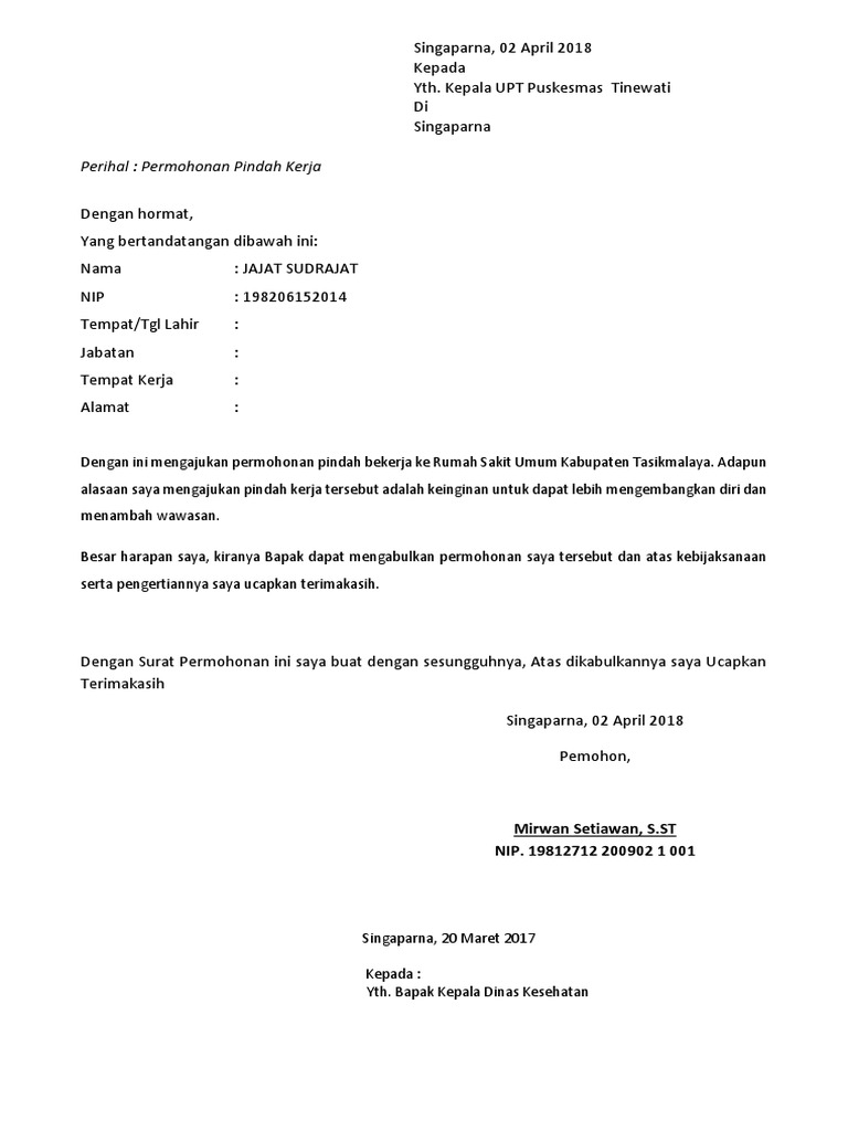 Jika anda menyukai contoh contoh ini mohon sumbangan like twit atau dengan berkomentar di bawah ini. Saya berharap bapak ibu sekalian dapat pindah ke tempat baru yang diinginkan agar bisa lebih dekat dengan keluarga tercinta. Contoh surat permohonan pindah tugas jika anda bekerja pada suatu instansi pemerintahan ataupun perusahaan swasta maka anda pun harus menaati semua peraturan yang ada tidak terkecuali dengan penempatan kerja. Demikianlah beberapa contoh surat permohonan mutasi atau pindah tugas kerja pns. Dalam penulisan sebuah surat kadang kala kita bingung harus dimulai dari mana. Berikut ini adalah sebuah contoh surat permohonan pindah kerja seorang pegawai negeri sipil.