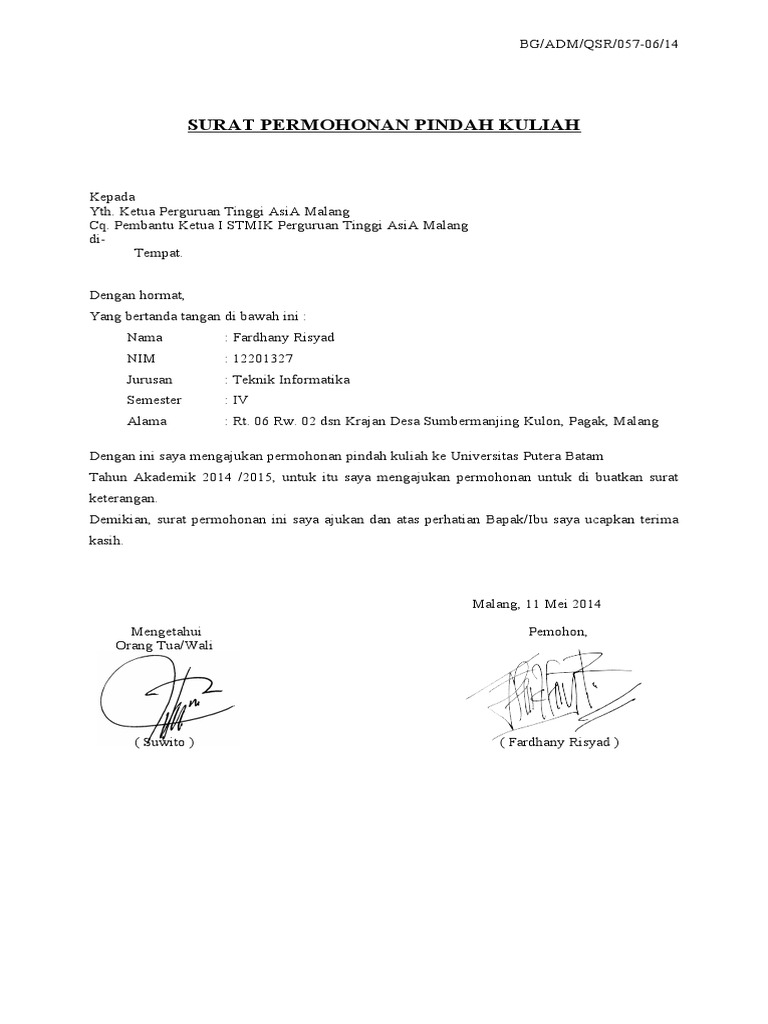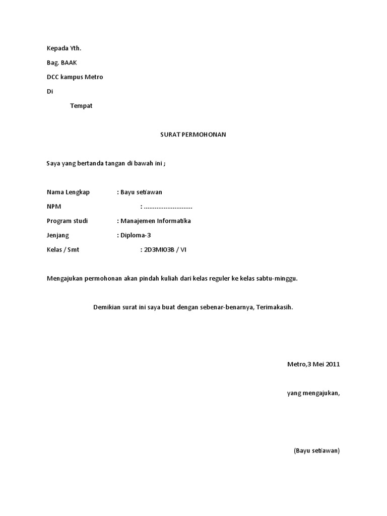 Tempohari sy ada pergi duta indonesi d kl tp permohonan x berjaya. Dan ada banyak alasan mengapa seorang mahasiswa ingin pindah kuliah mulai. Kartu hasil studi 4. Surat permohonan pindah kuliah kepada yth. Ketika saya konsul dengan ketua jurusan saya beliau mengatakan jika ingin pindah kelas menjadi kelas karyawan harus mengajukan surat pe.
